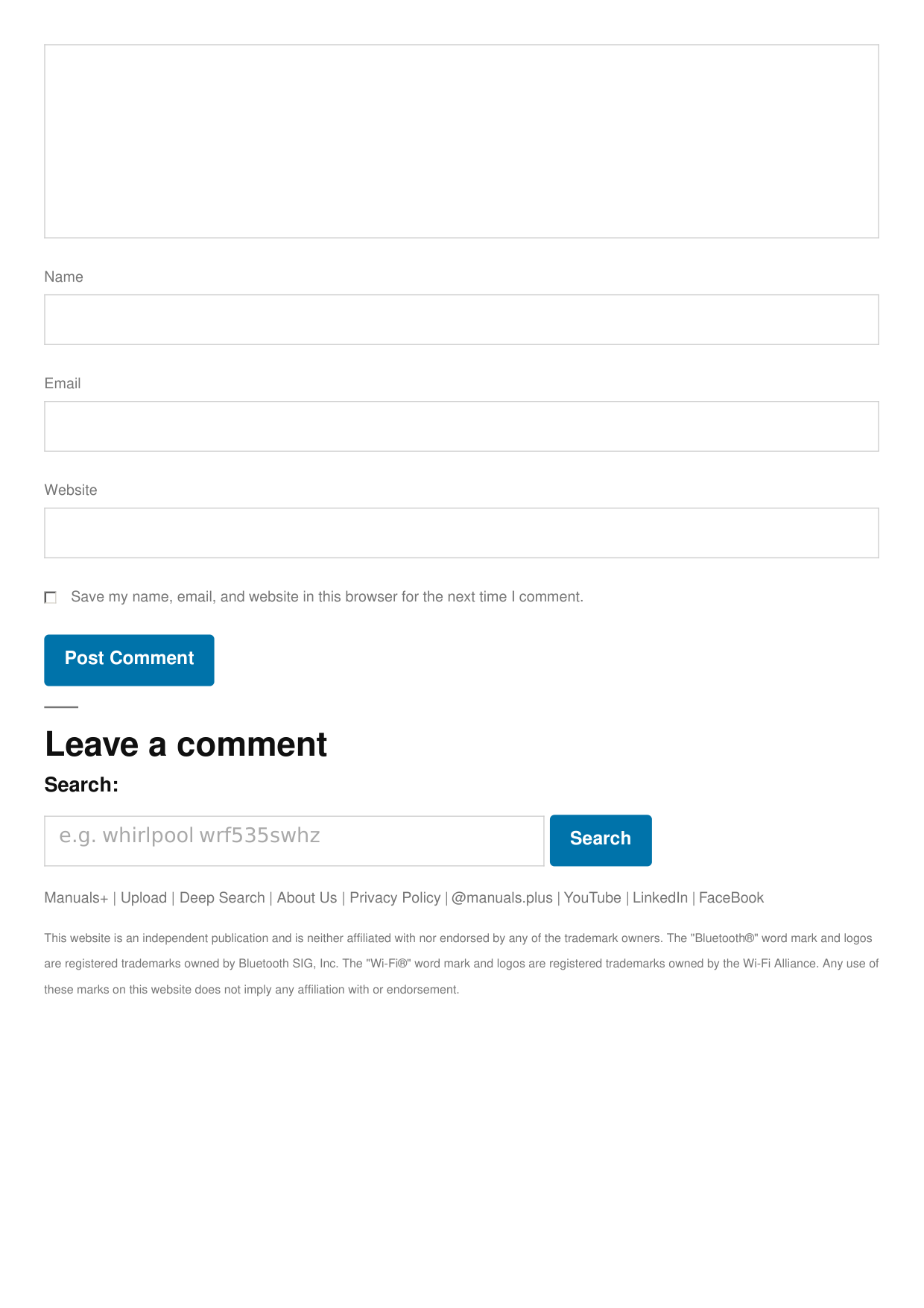 Search Manuals+ | Upload | Deep Search | About Us | Privacy Policy | @manuals.plus | YouTube | LinkedIn | FaceBook This website is an independent publication and is neither affiliated with nor endorsed by any of the trademark owners. The "Bluetooth®" word mark and logos are registered trademarks owned by Bluetooth SIG, Inc. The "Wi-Fi®" word mark and logos are registered trademarks owned by the Wi-Fi Alliance. Any use of these marks on this website does not imply any affiliation with or endorsement. Name Email Website Save my name, email, and website in this browser for the next time I comment. Post Comment