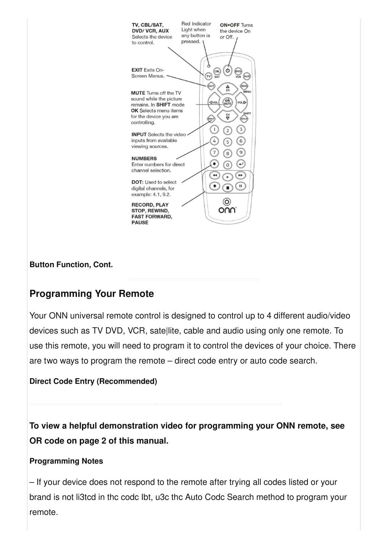 Button Function, Cont. Programming Your Remote Your ONN universal remote control is designed to control up to 4 different audio/video devices such as TV DVD, VCR, sate|lite, cable and audio using only one remote. To use this remote, you will need to program it to control the devices of your choice. There are two ways to program the remote – direct code entry or auto code search. Direct Code Entry (Recommended) To view a helpful demonstration video for programming your ONN remote, see OR code on page 2 of this manual. Programming Notes – If your device does not respond to the remote after trying all codes listed or your brand is not li3tcd in thc codc Ibt, u3c thc Auto Codc Search method to program your remote.