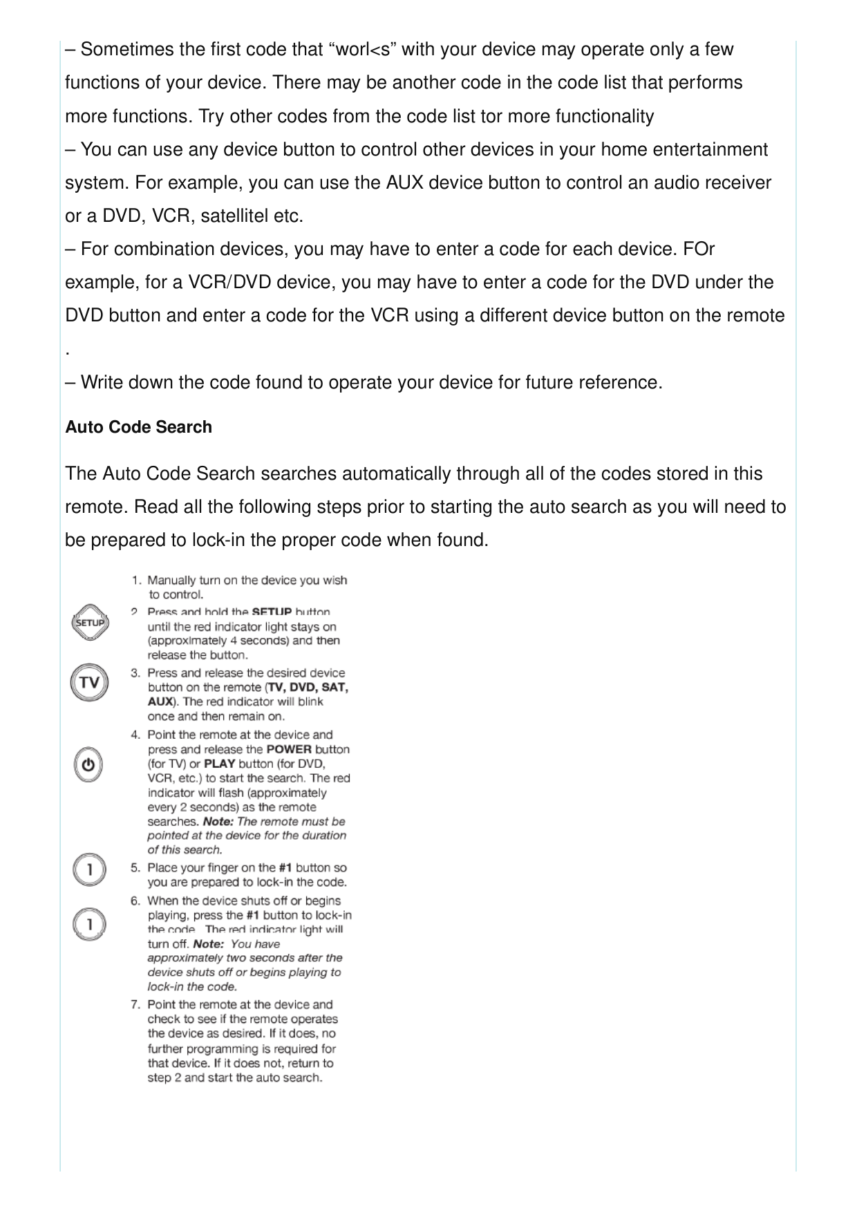 Troubleshooting Remote does not operate your device. – Make sure the batteries are fresh and installed correctly. – Aim the remote directly at your device, and make sure that there are no obstructions between the remote and device. – Make sure you select the appropriate device on the remote you wish to control, for example, TV for TV DVD for DVD, etc. – Try programming the remote with a different code. See Direct Code Entry section. – Remote may not be compatible with your device. Remote does not operate some features of your device. – Sometimes a particular code might operate a few features but not all. Try programming remote with a different code from the code fist. See Direct Code Entry section. – Remote may not be able to operate all features of your device or button names may be different than that of you~ original remoles. Remote Code is not available for a combo device ( e.g. TV/VCR, TV/DVD) – Some Combo devices Ce.g. TV/VCR TV/DVD, DVDNCR, etc.) will require you to set up two different Mode buttons to control bofh parts of the Combo device. For example, if you have a TV/DVD Combo, you might need to set up one code under the TV button to control the TV part AND a separate code (under any other Mode button) to control the DVD part.