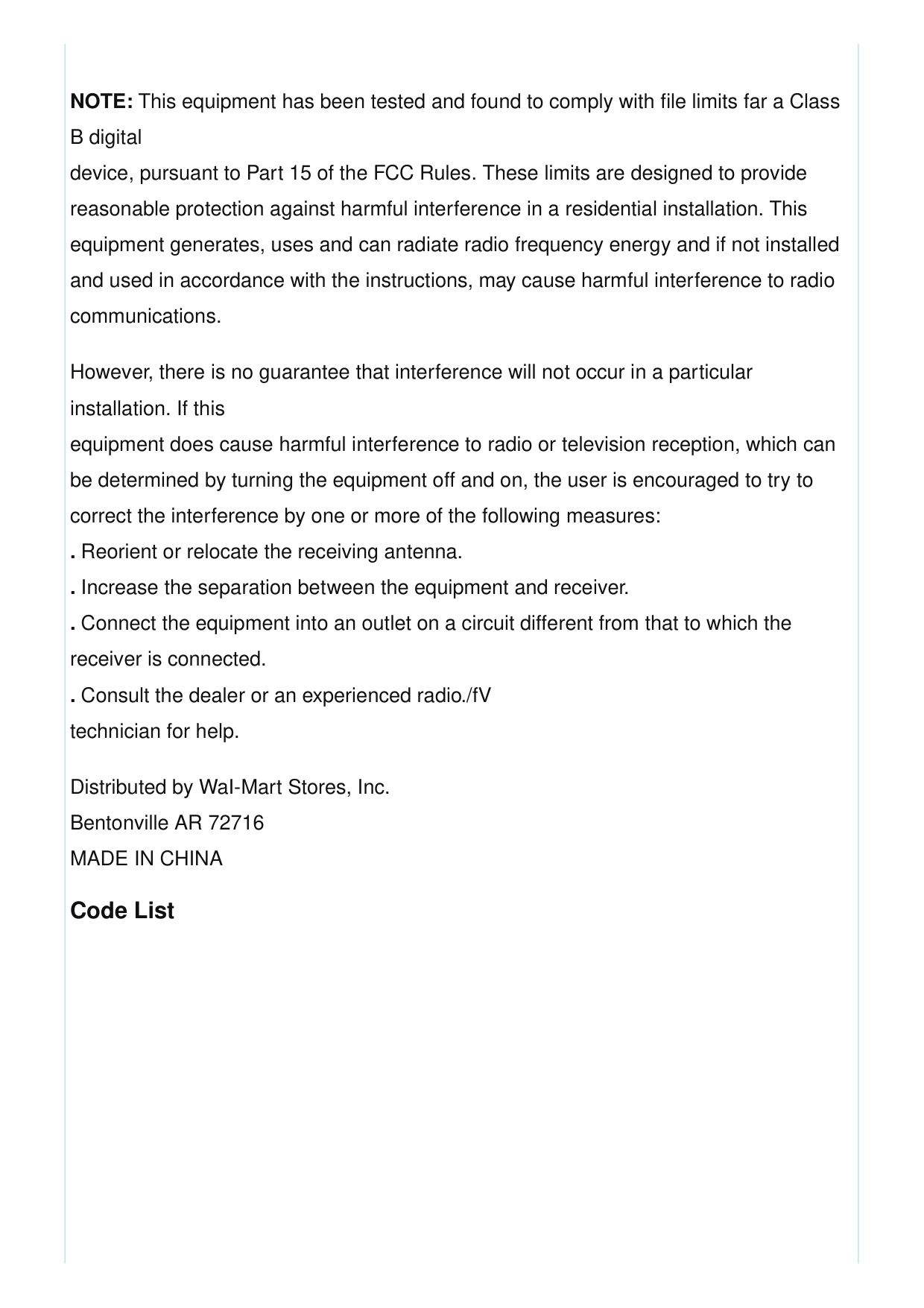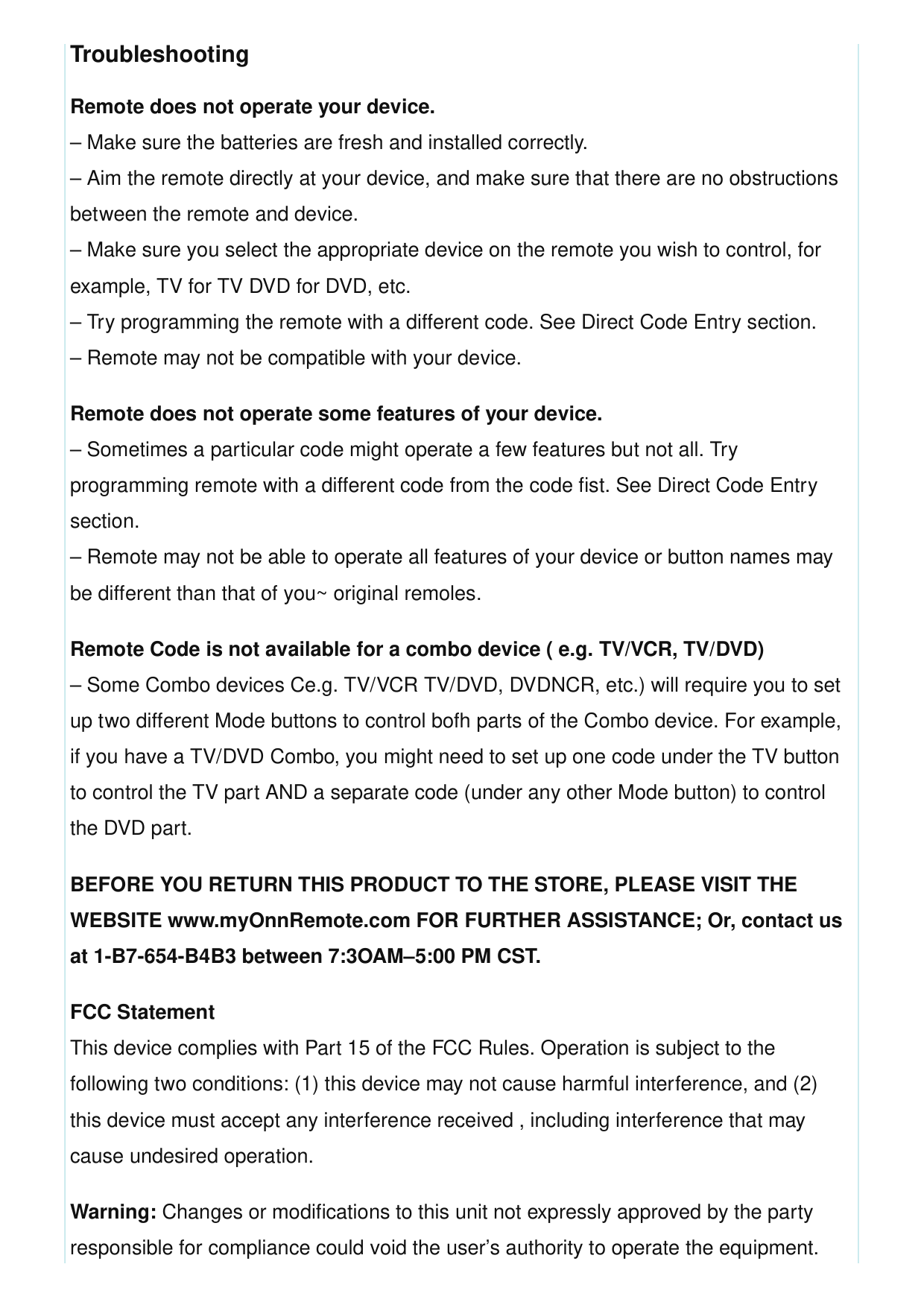 WEBSITE www.myOnnRemote.com FOR FURTHER ASSISTANCE; Or, contact us at 1-B7-654-B4B3 between 7:3OAM–5:00 PM CST. FCC Statement This device complies with Part 15 of the FCC Rules. Operation is subject to the following two conditions: (1) this device may not cause harmful interference, and (2) this device must accept any interference received , including interference that may cause undesired operation. Warning: Changes or modifications to this unit not expressly approved by the party responsible for compliance could void the user’s authority to operate the equipment.NOTE: This equipment has been tested and found to comply with file limits far a Class B digital device, pursuant to Part 15 of the FCC Rules. These limits are designed to provide reasonable protection against harmful interference in a residential installation. This equipment generates, uses and can radiate radio frequency energy and if not installed and used in accordance with the instructions, may cause harmful interference to radio communications. However, there is no guarantee that interference will not occur in a particular installation. If this equipment does cause harmful interference to radio or television reception, which can be determined by turning the equipment off and on, the user is encouraged to try to correct the interference by one or more of the following measures: . Reorient or relocate the receiving antenna. . Increase the separation between the equipment and receiver. . Connect the equipment into an outlet on a circuit different from that to which the receiver is connected. . Consult the dealer or an experienced radio./fV technician for help. Distributed by WaI-Mart Stores, Inc. Bentonville AR 72716