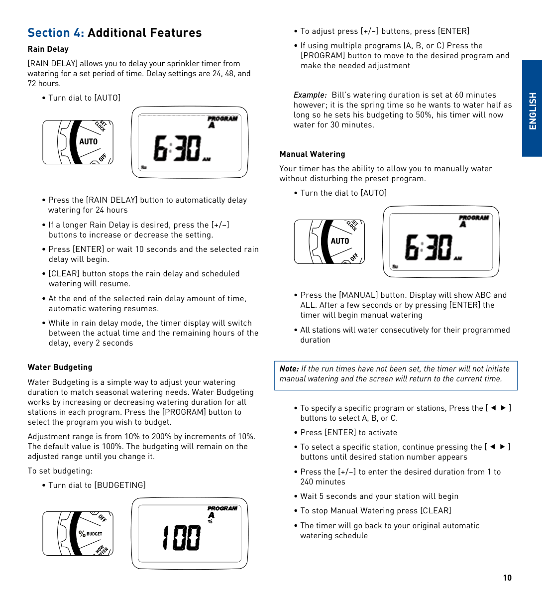 Section 4: Additional Features Rain Delay [RAIN DELAY] allows you to delay your sprinkler timer from watering for a set period of time. Delay settings are 24, 48, and 72 hours.
