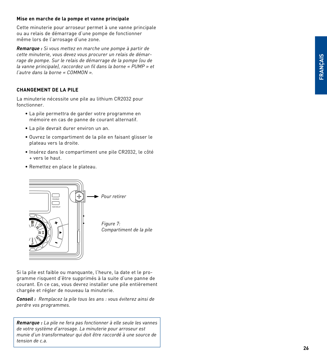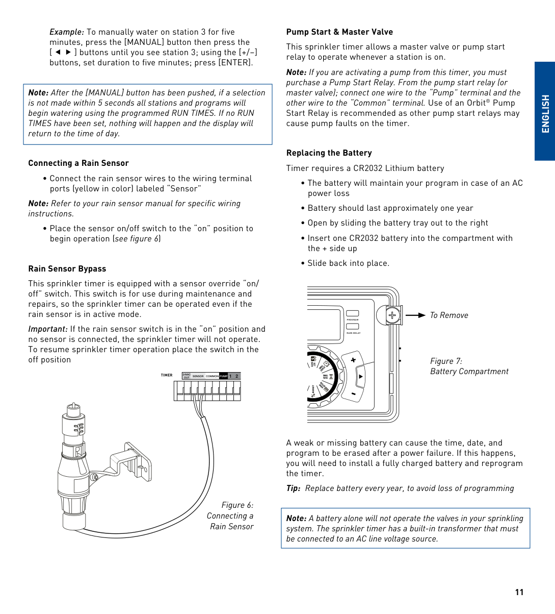 Pump Start & Master Valve This sprinkler timer allows a master valve or pump start relay to operate whenever a station is on. Note: If you are activating a pump from this timer, you must purchase a Pump Start Relay. From the pump start relay (or master valve); connect one wire to the “Pump” terminal and the other wire to the “Common” terminal. Use of an Orbit® Pump Start Relay is recommended as other pump start relays may cause pump faults on the timer. Replacing the Battery Timer requires a CR2032 Lithium batteryProgram