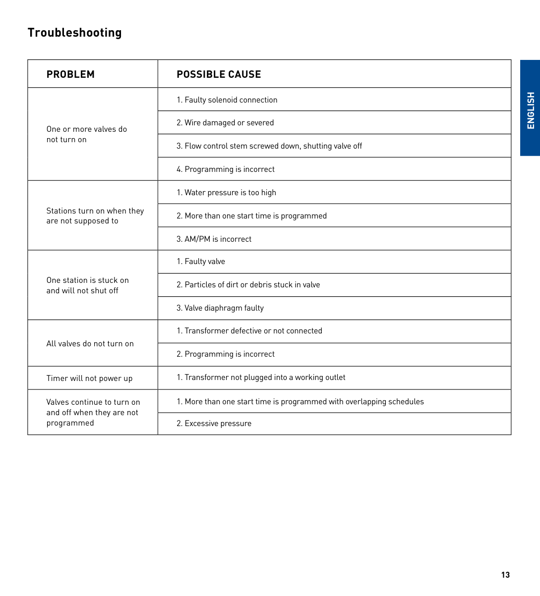 Un écran qui affiche le mot « FAULT » (défaillance) et la lettre « P » dans le coin supérieur gauche indique une défaillance de pompe. Aucun arrosage ne se produira en cas d’une défaillance de pompe. Les raisons courantes d’une défaillance de pompe comprennent : 1) un solénoïde défectueux sur la vanne principale, 2) un relais de démarrage de pompe incompatible ou défectueux, ou 3) le passage du fil entre la minuterie et le relais est trop long. Si une vanne principale est utilisée, il peut s’agir d’un solénoïde défectueux ou d’un câblage défectueux. Effectuer un contrôle de résistance sur le circuit pour vérifier la défaillance. Si vous utilisez un relais de démarrage de pompe, vérifiez la taille du fil et dirigez-vous vers le relais. Vérifiez que le relais fonctionne et assurez-vous d’avoir de bonnes connexions de fils. Pour effacer FAULT (défaillance) de l’écran, tournez le cadran de AUTO à une autre position, puis en le ramenant à AUTO. Il peut également être effacé en exécutant un cycle manuel.Aucun Courant