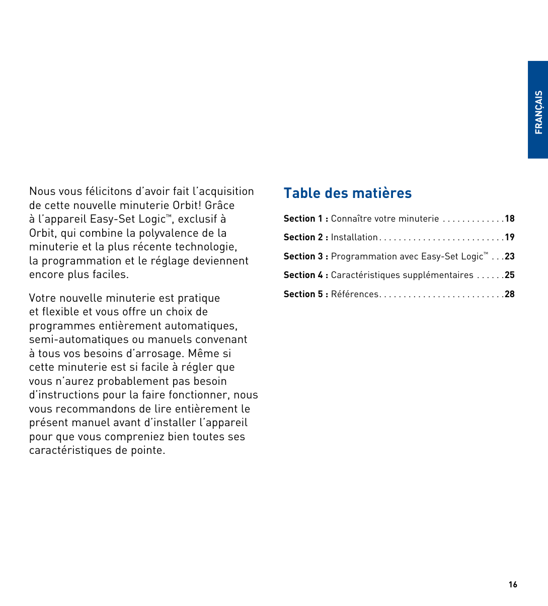 Felicitaciones por seleccionar su temporizador Orbit. Con el exclusivo Easy- Set Logic™ de Orbit, la programación y configuración simples se combinan con lo último en tecnología y versatilidad en temporizadores. Su nuevo temporizador brinda conveniencia y flexibilidad, lo que le permite ejecutar un programa de riego completamente automático, semiautomático o manual para todas sus necesidades de riego. Aunque este temporizador es tan fácil de programar que probablemente no necesitará instrucciones, le recomendamos leer este manual completo antes de la instalación, de manera que comprenda todas las características avanzadas.32