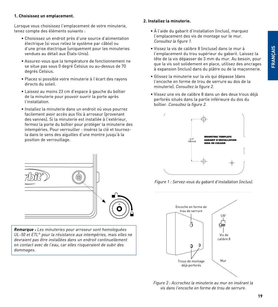 La minuterie pour arroseur est testée selon la norme UL 50 et homologuée ETL®. Les modèles internationaux appropriés sont approuvés CSA® et CE®. Cet appareil numérique de la catégorie B est conforme à la norme NMB-003 du Canada. Déconnexion : Type 1Y Conditions de pollution normales. Seul le fabricant ou un de ses agents accrédités peut remplacer le cordon d’alimentation de cet appareil.Avis Sur La Marque De Commerce
