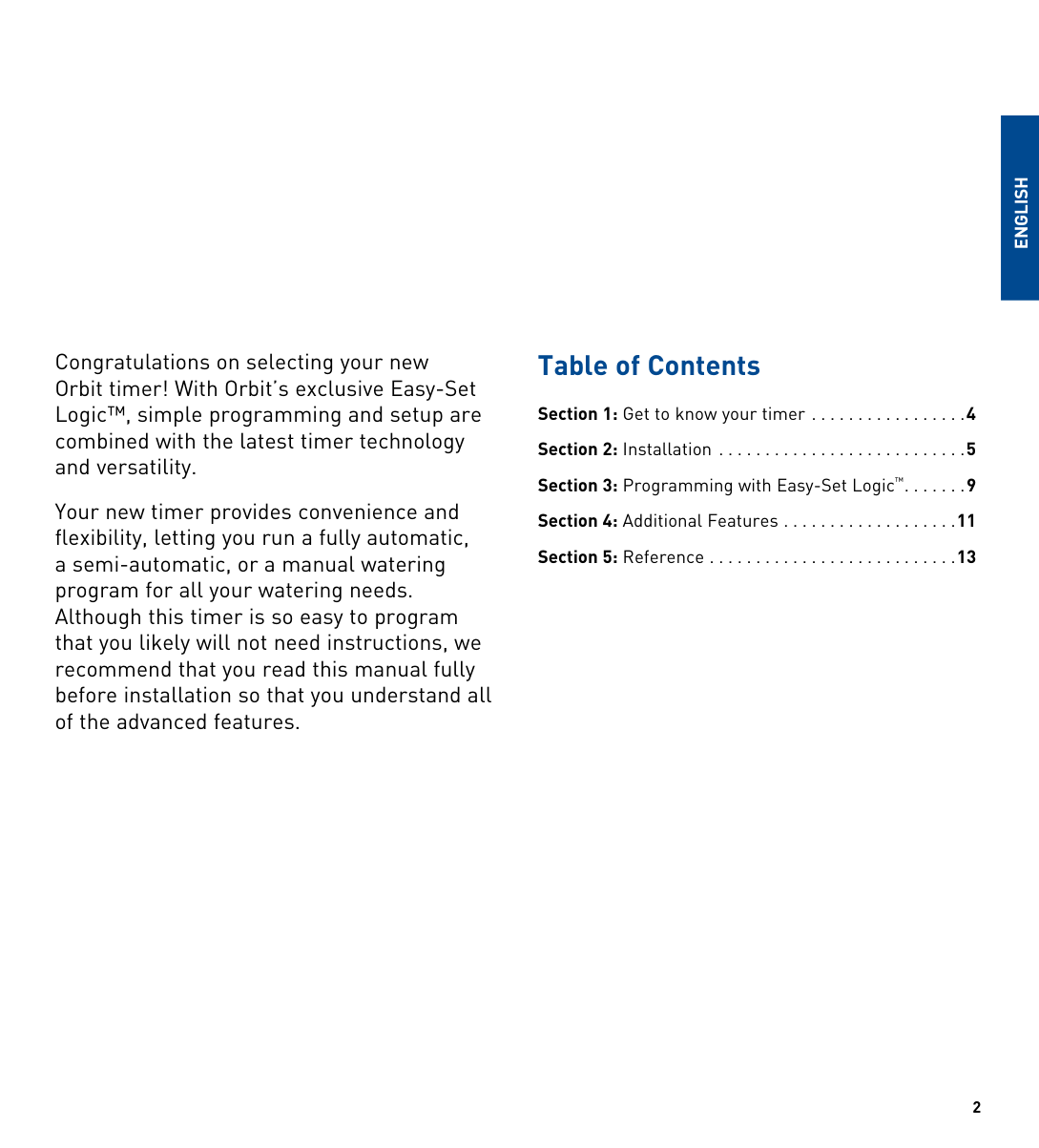 Congratulations on selecting your new Orbit timer! With Orbit’s exclusive Easy-Set Logic™, simple programming and setup are combined with the latest timer technology and versatility. Your new timer provides convenience and flexibility, letting you run a fully automatic, a semi-automatic, or a manual watering program for all your watering needs. Although this timer is so easy to program that you likely will not need instructions, we recommend that you read this manual fully before installation so that you understand all of the advanced features.3