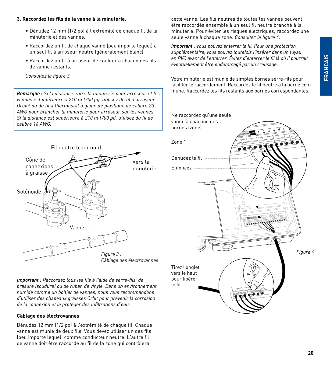 Orbit® Irrigation Products, Inc. garantit à ses clients que ses produits sont exempts de tout défaut de matériaux et de fabri- cation, et ce, pendant six ans à compter de la date d’achat. Pendant une période de six ans après la date d’achat, nous remplacerons sans frais les pièces défectueuses ou qui s’avéreront défectueuses si elles ont été utilisées dans les conditions normales d’utilisation et de service (preuve d’achat requise). Nous nous réservons le droit d’inspecter toute pièce défectueuse avant de la remplacer. Orbit® Irrigation Products, Inc. n’est pas responsable des dommages et des coûts accessoires ou consécutifs causés par une défectuosité du produit. En vertu de la présente garantie, la responsabilité d’Orbit® se limite exclusivement au remplacement ou à la réparation des pièces défectueuses. Pour exercer votre garantie, renvoyez le produit à votre détaillant accompagné d’une copie de votre reçu. Cet appareil est conforme à l’alinéa 15 du règlement de la FCC. Son utilisation est soumise aux deux conditions suivantes : (1) Cet appareil ne doit provoquer aucune interférence nuisible; et (2) cet appareil doit accepter toute interférence reçue, y compris les interférences pouvant entraîner un fonctionnement indésirable. Avertissement : Les modifications non autorisées expressément par la partie responsable de la conformité peuvent annuler le droit de l’utilisateur de se servir de cet appareil. REMARQUE : Cet appareil a été testé et déclaré conforme aux limites imposées aux appareils numériques de catégorie B, conformément à l’alinéa 15 du règlement de la FCC. Ces limites sont destinées à assurer une protection raisonnable contre les interférences nuisibles dans un environnement résidentiel. Cet appareil génère, utilise et peut émettre de l’énergie radiofréquence et, s’il n’est pas installé et utilisé conformément aux instructions, risque de provoquer des interférences nuisibles aux communications radio. Cependant, tout risque d’interférence ne peut être totalement exclu. S’il constate des interférences lors de la réception d’émissions de radio ou de télévision (il suffit pour le vérifier d’allumer et d’éteindre successivement l’appareil), l’utilisateur devra prendre les mesures nécessaires pour les éliminer. À cette fin, il devra :Français