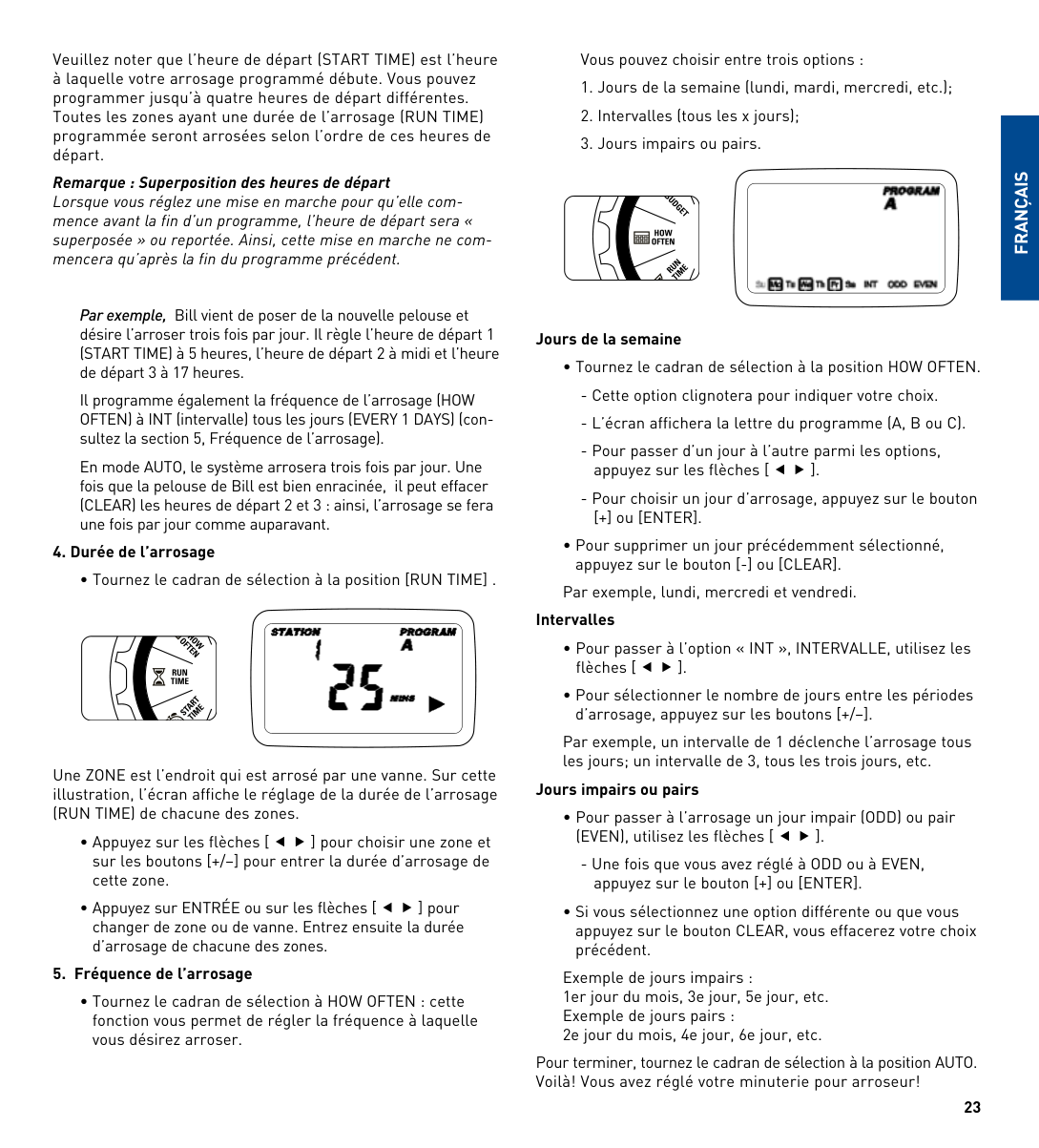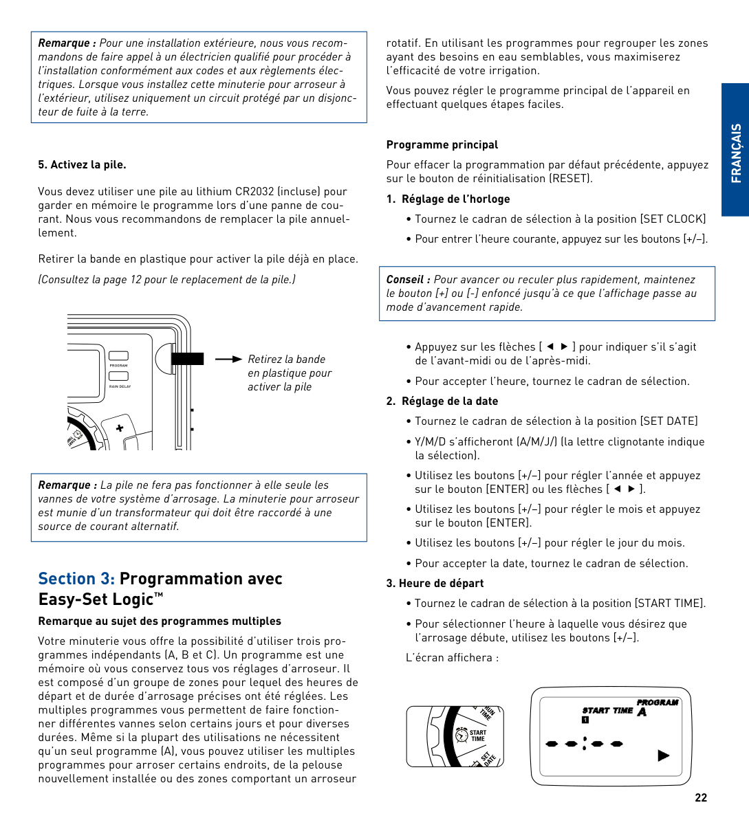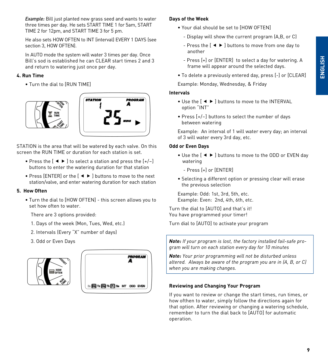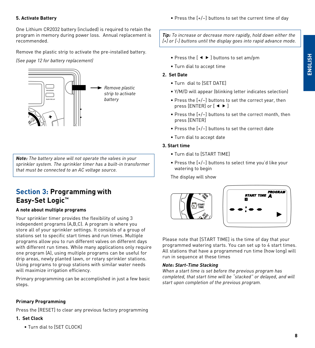 Remove plastic strip to activate batteryPlease note that [START TIME] is the time of day that your programmed watering starts. You can set up to 4 start times. All stations that have a programmed run time (how long) will run in sequence at these times Note: Start-Time Stacking When a start time is set before the previous program has completed, that start time will be “stacked” or delayed, and will start upon completion of the previous program.