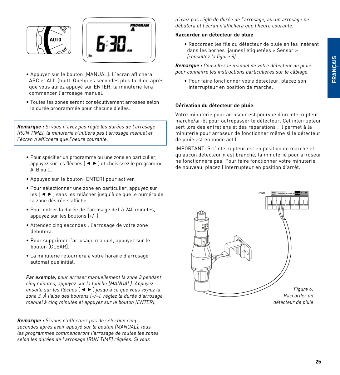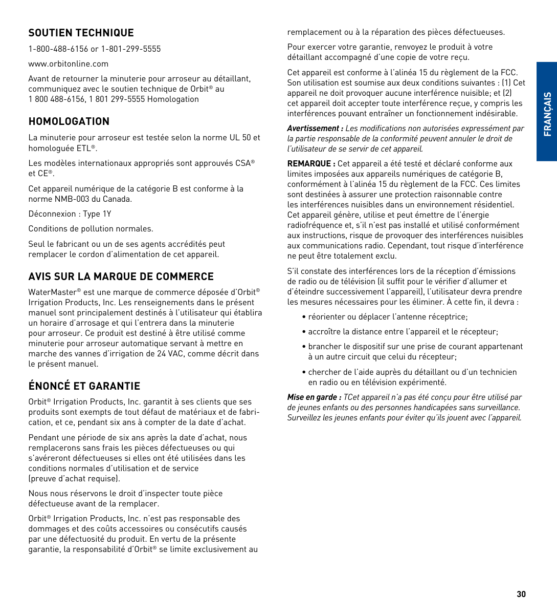 WaterMaster® est une marque de commerce déposée d’Orbit® Irrigation Products, Inc. Les renseignements dans le présent manuel sont principalement destinés à l’utilisateur qui établira un horaire d’arrosage et qui l’entrera dans la minuterie pour arroseur. Ce produit est destiné à être utilisé comme minuterie pour arroseur automatique servant à mettre en marche des vannes d’irrigation de 24 VAC, comme décrit dans le présent manuel.Énoncé Et Garantie