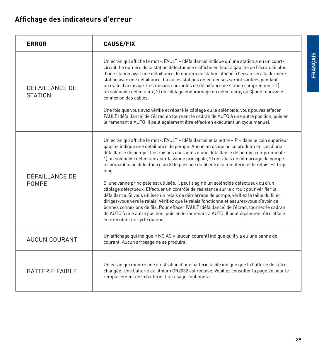 Un écran qui montre une illustration d’une batterie faible indique que la batterie doit être changée. Une batterie au lithium CR2032 est requise. Veuillez consulter la page 26 pour le remplacement de la batterie. L’arrosage continuera. Affichage des indicateurs d’erreurFrançais