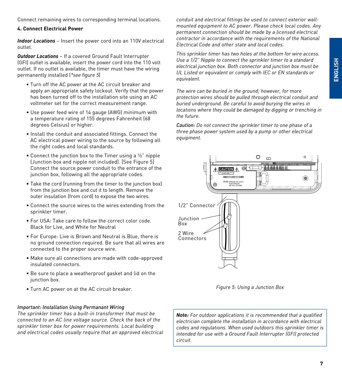 37 Nota: Se recomienda que un electricista calificado realice la instalación para aplicaciones en el exterior, de acuerdo con las regulaciones y los códigos eléctricos. Cuando se utiliza en exteriores, este temporizador de regador se debe utilizar con un circuito protegido de interruptor de falla a tierra (GFI).