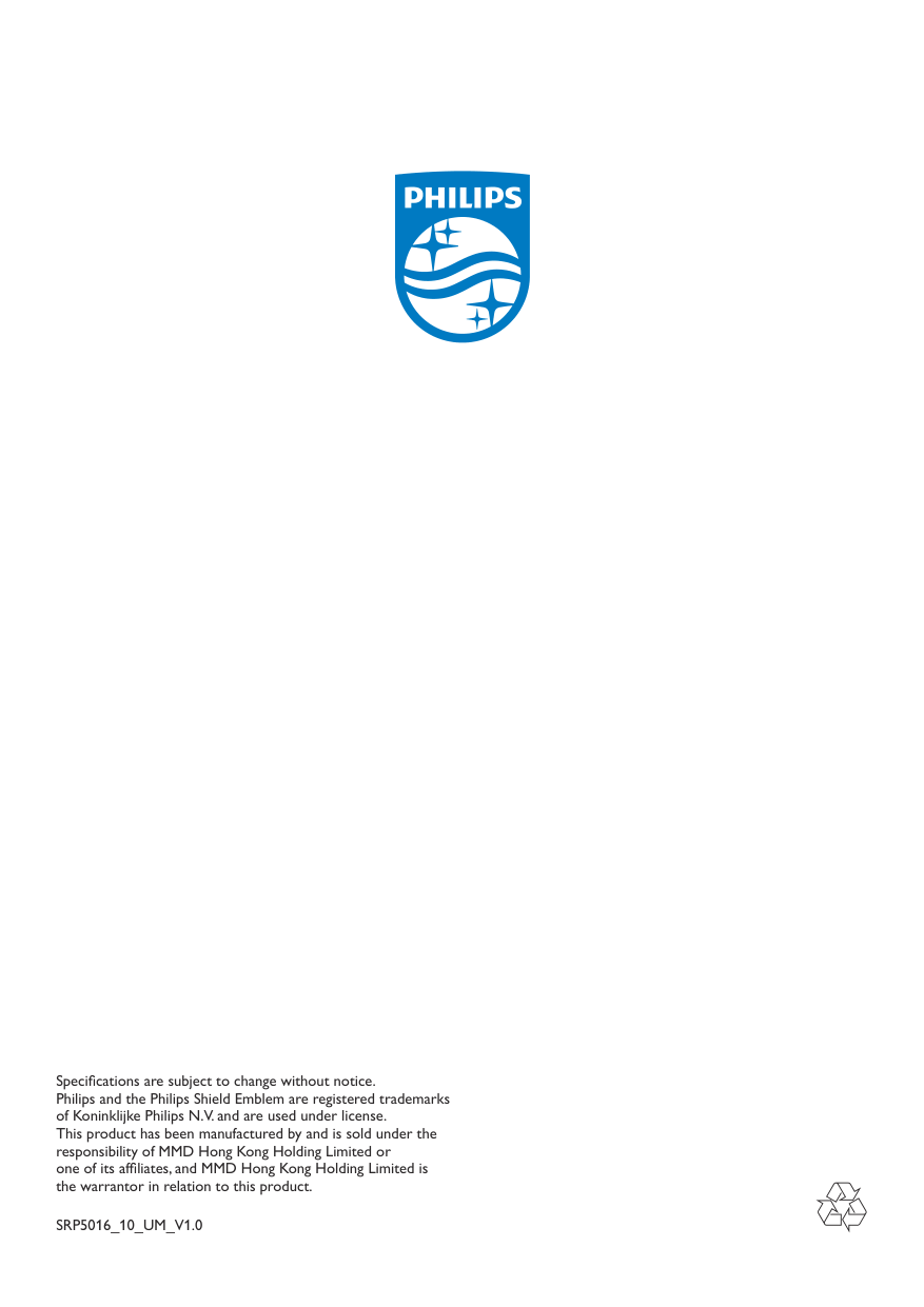 Specifications are subject to change without notice. Philips and the Philips Shield Emblem are registered trademarks of Koninklijke Philips N.V. and are used under license. This product has been manufactured by and is sold under the responsibility of MMD Hong Kong Holding Limited or one of its affiliates, and MMD Hong Kong Holding Limited is the warrantor in relation to this product.
