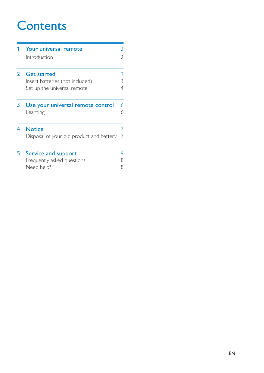 Contents 1 Your universal remote 2 Introduction 2 2 Get started 3 Insert batteries (not included) 3 Set up the universal remote 4 3 Use your universal remote control 6 Learning 6 4 Notice 7 Disposal of your old product and battery 7 5 Service and support 8 Frequently asked questions 8 Need help? 82