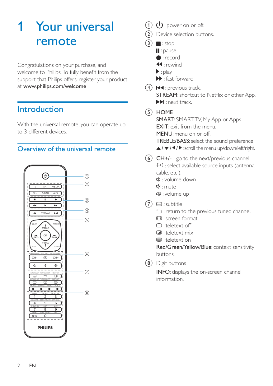 1 Your universal remote Congratulations on your purchase, and welcome to Philips! To fully benefit from the support that Philips offers, register your product at www.philips.com/welcome Introduction With the universal remote, you can operate up to 3 different devices. Overview of the universal remoteSat