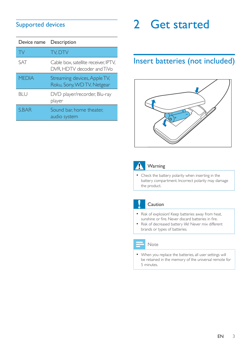 Sound bar, home theater, audio system 2 Get started Insert batteries (not included) Warning •• Check the battery polarity when inserting in the battery compartment. Incorrect polarity may damage the product. Caution •• Risk of explosion! Keep batteries away from heat, sunshine or fire. Never discard batteries in fire. •• Risk of decreased battery life! Never mix different brands or types of batteries. Note •• When you replace the batteries, all user settings will be retained in the memory of the universal remote for 5 minutes.4