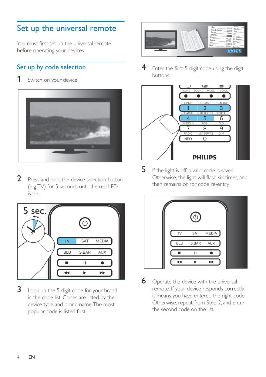 Set up the universal remote You must first set up the universal remote before operating your devices. Set up by code selection 1 Switch on your device. 2 Press and hold the device selection button (e.g. TV) for 5 seconds until the red LED is on.Sat