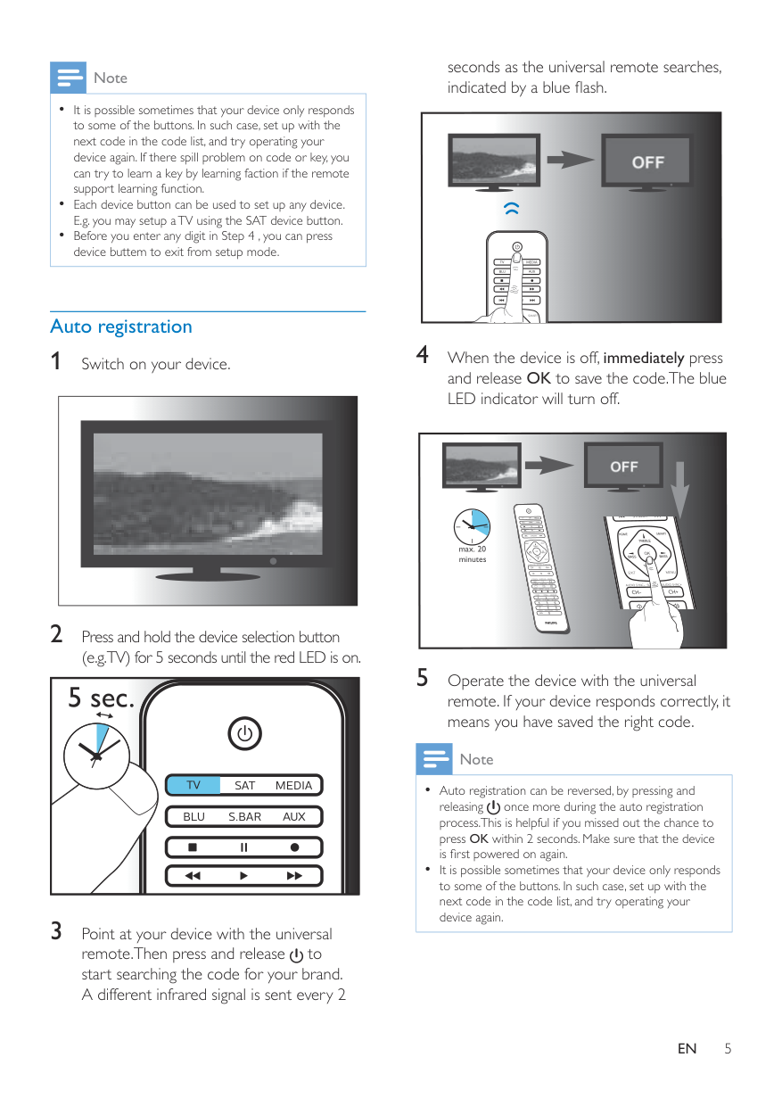 Note •• It is possible sometimes that your device only responds to some of the buttons. In such case, set up with the next code in the code list, and try operating your device again. If there spill problem on code or key, you can try to learn a key by learning faction if the remote support learning function. •• Each device button can be used to set up any device. E.g. you may setup a TV using the SAT device button. •• Before you enter any digit in Step 4 , you can press device buttem to exit from setup mode. Auto registration 1 Switch on your device. 2 Press and hold the device selection button (e.g. TV) for 5 seconds until the red LED is on.Sat