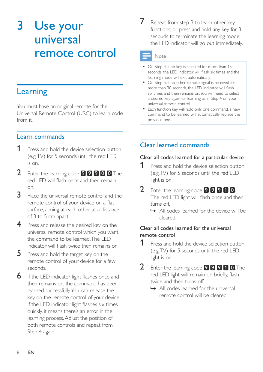 3 Use your universal remote control Learning You must have an original remote for the Universal Remote Control (URC) to learn code from it. Learn commands 1 Press and hold the device selection button (e.g. TV) for 5 seconds until the red LED is on. 2 Enter the learning code 9 9 9 0 0 . The red LED will flash once and then remain on. 3 Place the universal remote control and the remote control of your device on a flat surface, aiming at each other at a distance of 3 to 5 cm apart. 4 Press and release the desired key on the universal remote control which you want the command to be learned. The LED indicator will flash twice then remains on. 5 Press and hold the target key on the remote control of your device for a few seconds. 6 If the LED indicator light flashes once and then remains on, the command has been learned successfully. You can release the key on the remote control of your device. If the LED indicator light flashes six times quickly, it means there’s an error in the learning process. Adjust the position of both remote controls and repeat from Step 4 again. 7 Repeat from step 3 to learn other key functions, or press and hold any key for 3 secouds to terminate the learning mode, the LED indicator will go out immediately. Note •• On Step 4, if no key is selected for more than 15 seconds, the LED indicator will flash six times and the learning mode will exit automatically. •• On Step 5, if no other remote signal is received for more than 30 seconds, the LED indicator will flash six times and then remains on. You will need to select a desired key again for learning as in Step 4 on your universal remote control. •• Each function key will hold only one command, a new command to be learned will automatically replace the previous one. Clear learned commands Clear all codes learned for a particular device 1 Press and hold the device selection button (e.g.TV) for 5 seconds until the red LED light is on. 2 Enter the learning code 9 9 9 1 0 . The red LED light will flash once and then turns off. » » All codes learned for the device will be cleared. Clear all codes learned for the universal remote control 1 Press and hold the device selection button (e.g.TV) for 5 seconds until the red LED light is on. 2 Enter the learning code 9 9 9 1 0 . The red LED light will remain on briefly, flash twice and then turns off. » » All codes learned for the universal remote control will be cleared.7