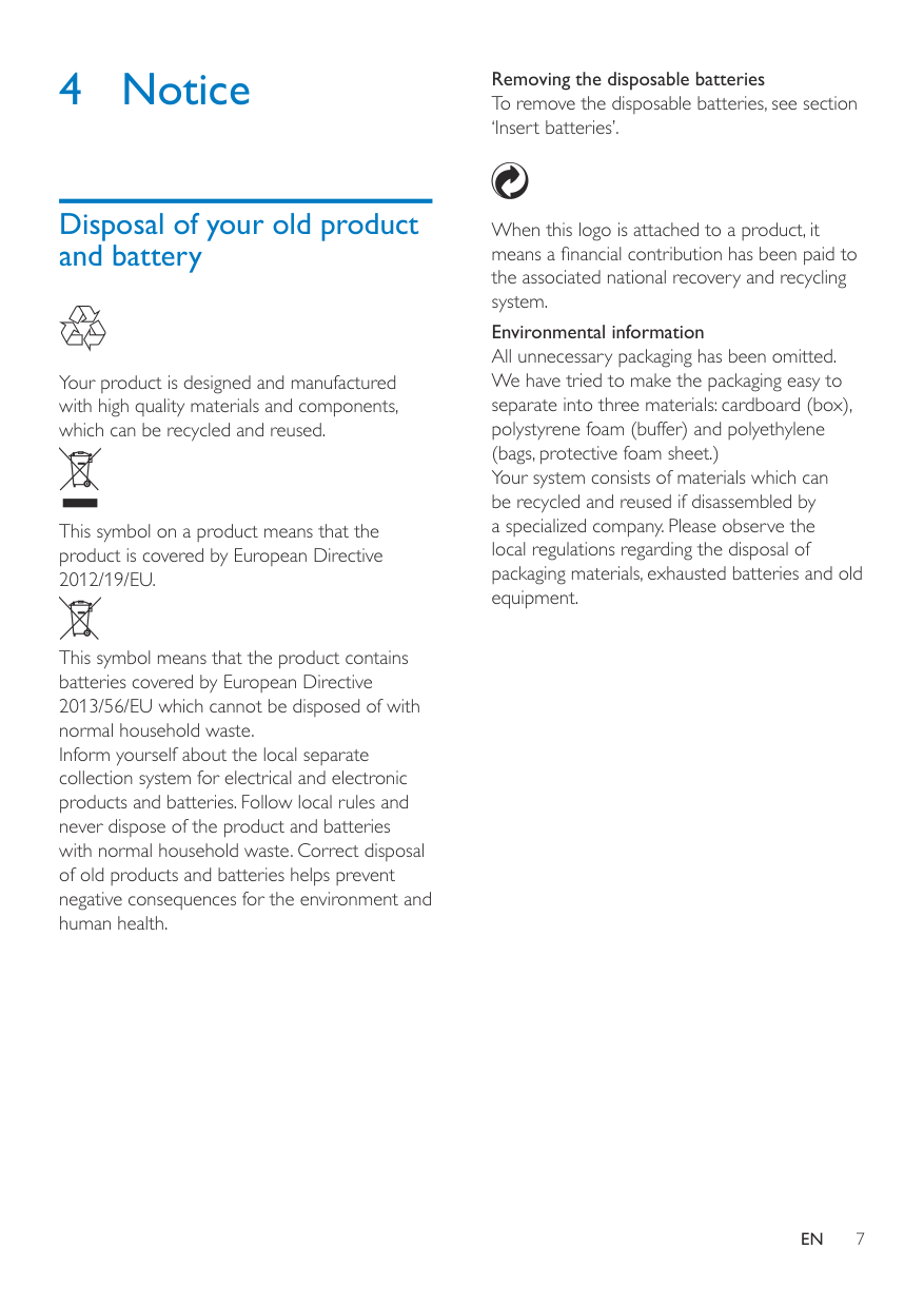 4 Notice Disposal of your old product and battery Your product is designed and manufactured with high quality materials and components, which can be recycled and reused. This symbol on a product means that the product is covered by European Directive2012/19/Eu.