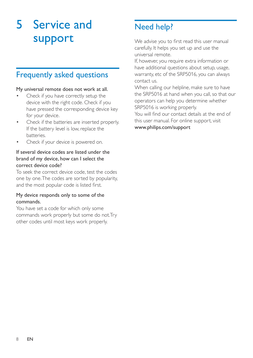 This symbol means that the product contains batteries covered by European Directive 2013/56/EU which cannot be disposed of with normal household waste. Inform yourself about the local separate collection system for electrical and electronic products and batteries. Follow local rules and never dispose of the product and batteries with normal household waste. Correct disposal of old products and batteries helps prevent negative consequences for the environment and human health. Removing the disposable batteries To remove the disposable batteries, see section ‘Insert batteries’. When this logo is attached to a product, it means a financial contribution has been paid to the associated national recovery and recycling system. Environmental information All unnecessary packaging has been omitted. We have tried to make the packaging easy to separate into three materials: cardboard (box), polystyrene foam (buffer) and polyethylene (bags, protective foam sheet.) Your system consists of materials which can be recycled and reused if disassembled by a specialized company. Please observe the local regulations regarding the disposal of packaging materials, exhausted batteries and old equipment.8 Need help? We advise you to first read this user manual carefully. It helps you set up and use the universal remote. If, however, you require extra information or have additional questions about setup, usage, warranty, etc of the SRP5016, you can always contact us. When calling our helpline, make sure to have the SRP5016 at hand when you call, so that our operators can help you determine whether SRP5016 is working properly. You will find our contact details at the end of this user manual. For online support, visit www.philips.com/support 5 Service and support Frequently asked questions My universal remote does not work at all. • Check if you have correctly setup the device with the right code. Check if you have pressed the corresponding device key for your device. • Check if the batteries are inserted properly. If the battery level is low, replace the batteries. • Check if your device is powered on. If several device codes are listed under the brand of my device, how can I select the correct device code? To seek the correct device code, test the codes one by one. The codes are sorted by popularity, and the most popular code is listed first. My device responds only to some of the commands. You have set a code for which only some commands work properly but some do not.Try other codes until most keys work properly.