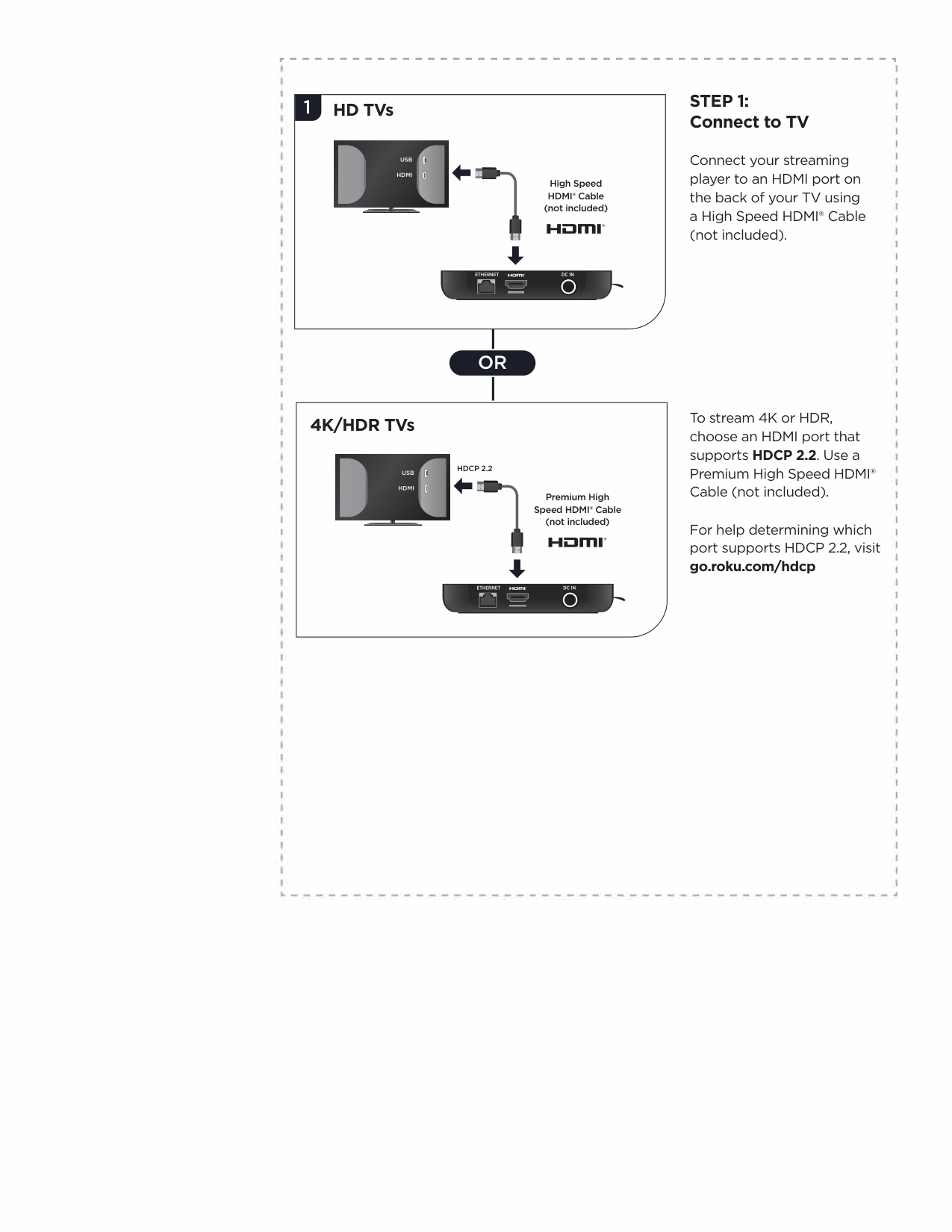 Connect to TV Connect your streaming player to an HDMI port on the back of your TV using a High Speed HDMI® Cable (not included). To stream 4K or HDR, choose an HDMI port that supports HDCP 2.2. Use a Premium High Speed HDMI® Cable (not included). For help determining which port supports HDCP 2.2, visit go.roku.com/hdcp HD TVs 4K/HDR TVsHdcp 2.2