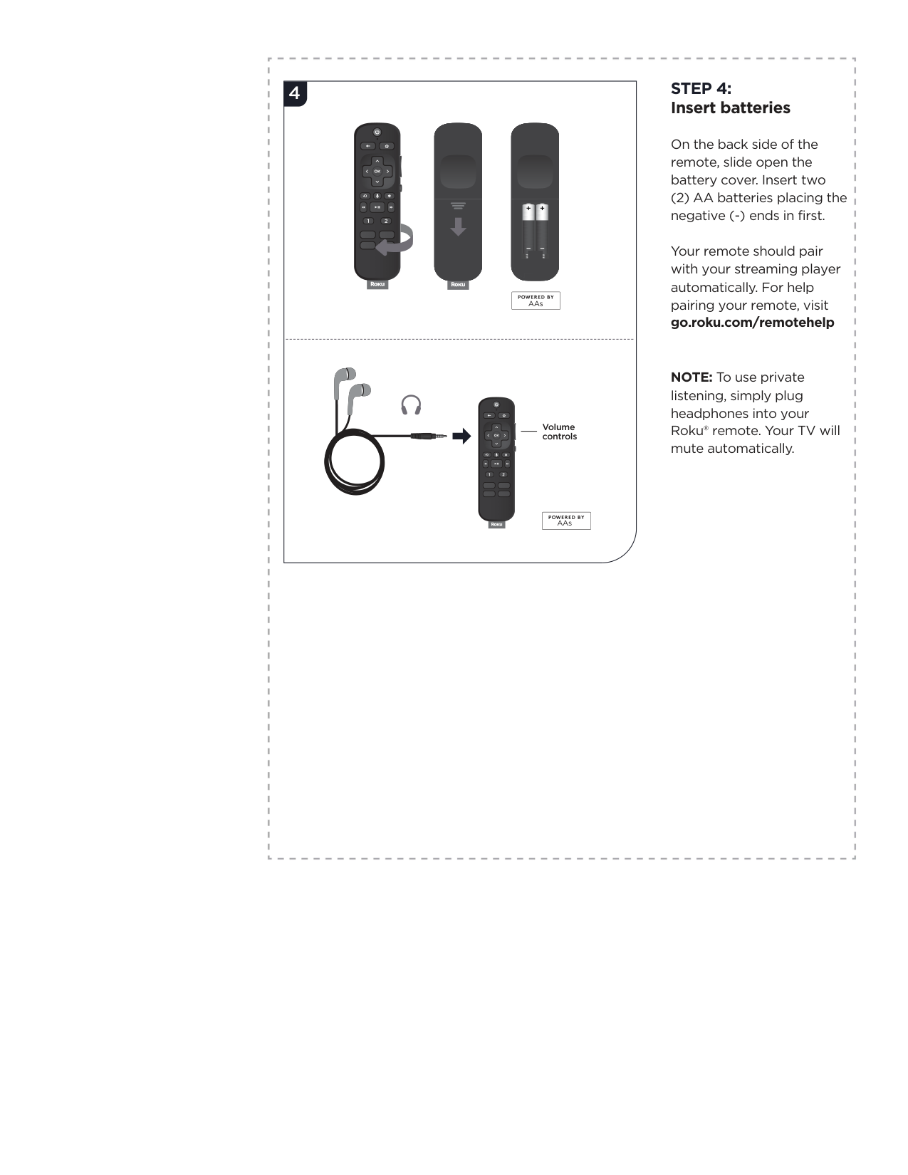 Insert batteries On the back side of the remote, slide open the battery cover. Insert two (2) AA batteries placing the negative (-) ends in first. Your remote should pair with your streaming player automatically. For help pairing your remote, visit go.roku.com/remotehelp NOTE: To use private listening, simply plug headphones into your Roku® remote. Your TV will mute automatically. Volume controls AAs AAs55 Let’s get started English Deutsch Español Français 12:40 pm | Options