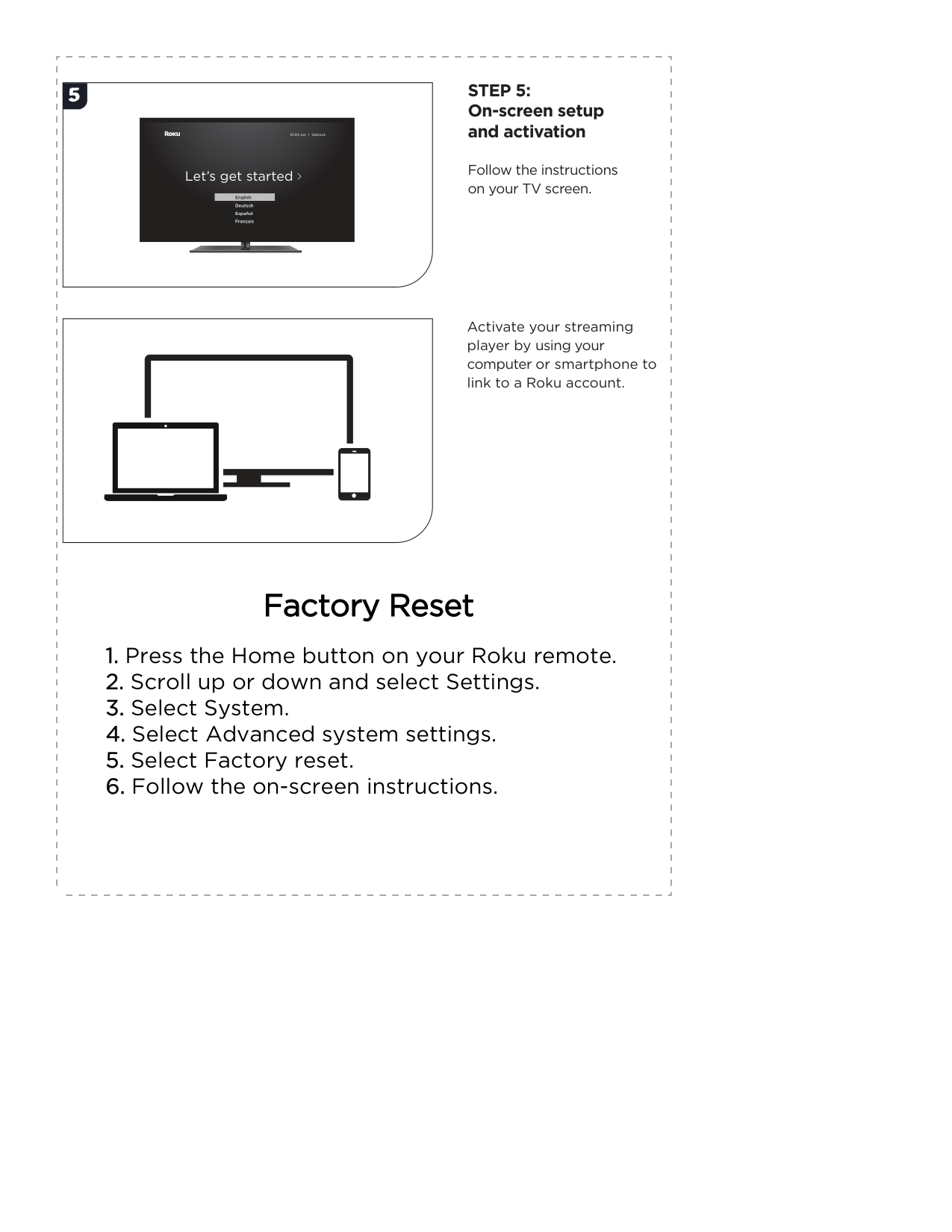 Power on TV and select input Use your TV remote to power on your TV and select the input you used to connect your streaming player. For help on how to select the correct input, visit go.roku.com/selectinput AntennaA/V 1