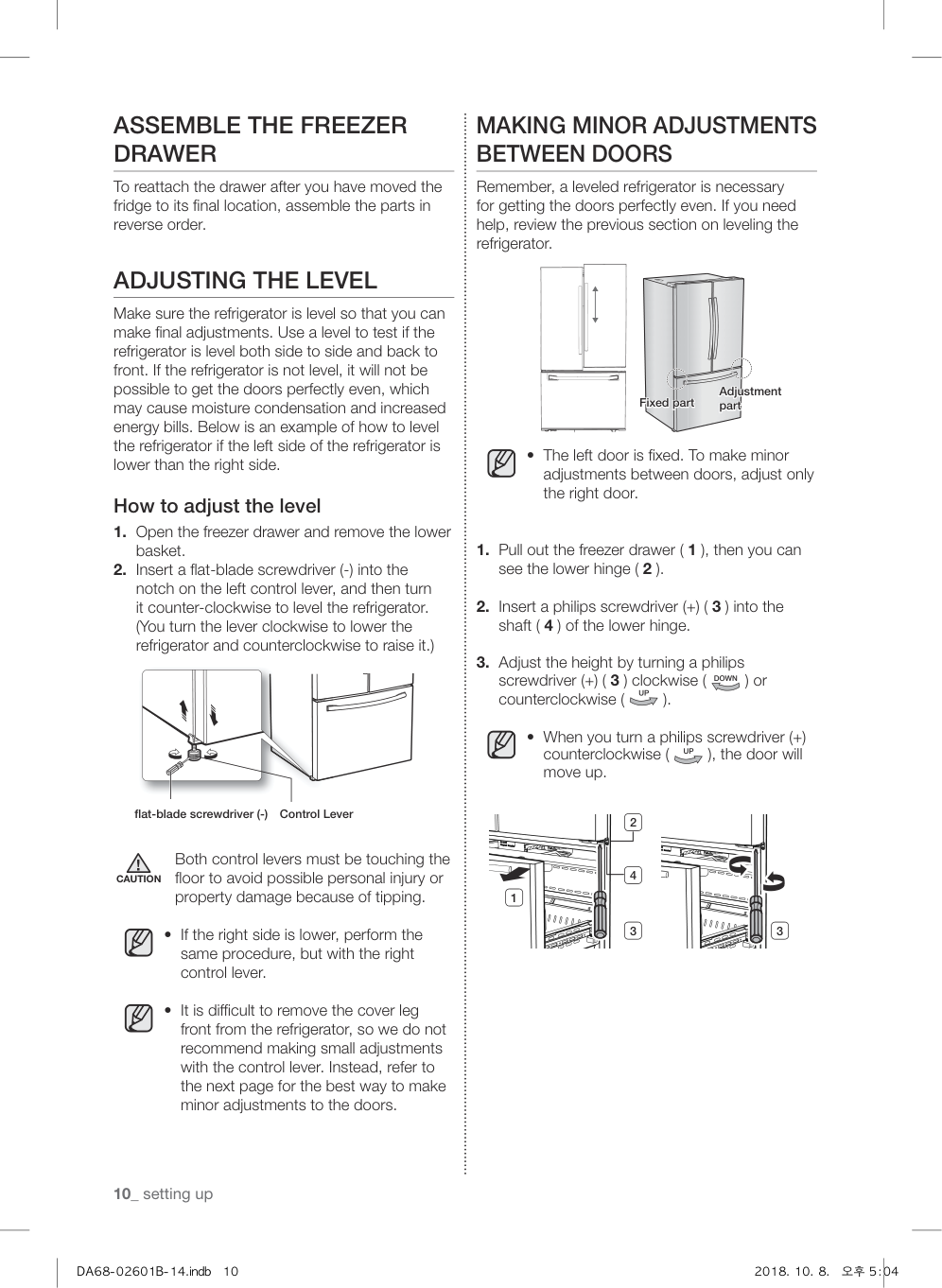 For some installations you need to remove the fridge and freezer drawers so you can move the refrigerator to its final location. Do not remove the doors/drawer if you don’t need to. If you do not need to remove the refrigerator doors, go to Adjusting the Level on page 10. If you need to remove the doors. continue below. Before removing the door/drawer, make sure you read the following items: Disconnect power to the refrigerator before removing the door or drawer.How To Assemble The Handle