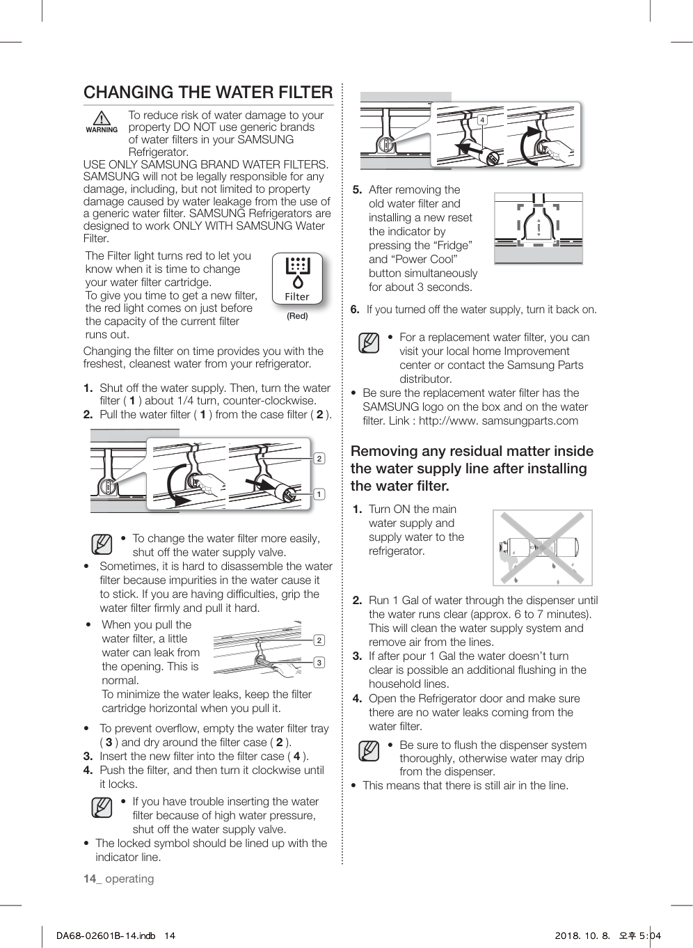 First, shut off the water supply and turn the water filter about 1/4 turn counter-clockwise. Pull the water filter from the case filter, then insert the new filter and push it in before turning it clockwise until it locks. After installing the new filter, reset the indicator by pressing the Fridge and Power Cool buttons simultaneously for about 3 seconds.
