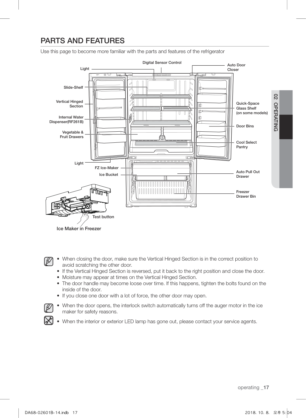 Cette page permet de vous familiariser avec les pièces et caractéristiques du réfrigérateur. vG{ GwG~ Étagère coulissante Éclairage Section à charnière verticale Distributeur d’eau interne (RF261B) Tiroirs à fruits et légumes Machine à glaçons du congélateur Éclairage Bac à glace bouton de test machine à glaçons dans le congélateur Système de fermeture de porte Clayette en verre intermédiaire (sur certains modèles) Bacs de la porte Compartiment réglable Cool Select Pantry Tiroir à ouverture automatique Bac du tiroir du congélateur Contrôle des capteurs numériques18_ Fonctionnement