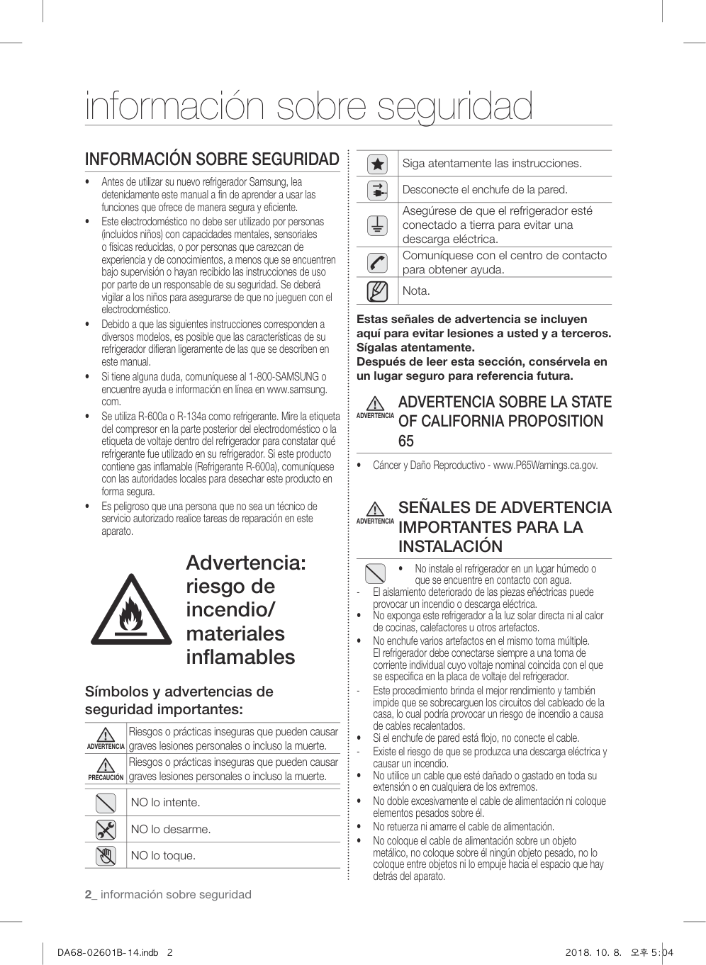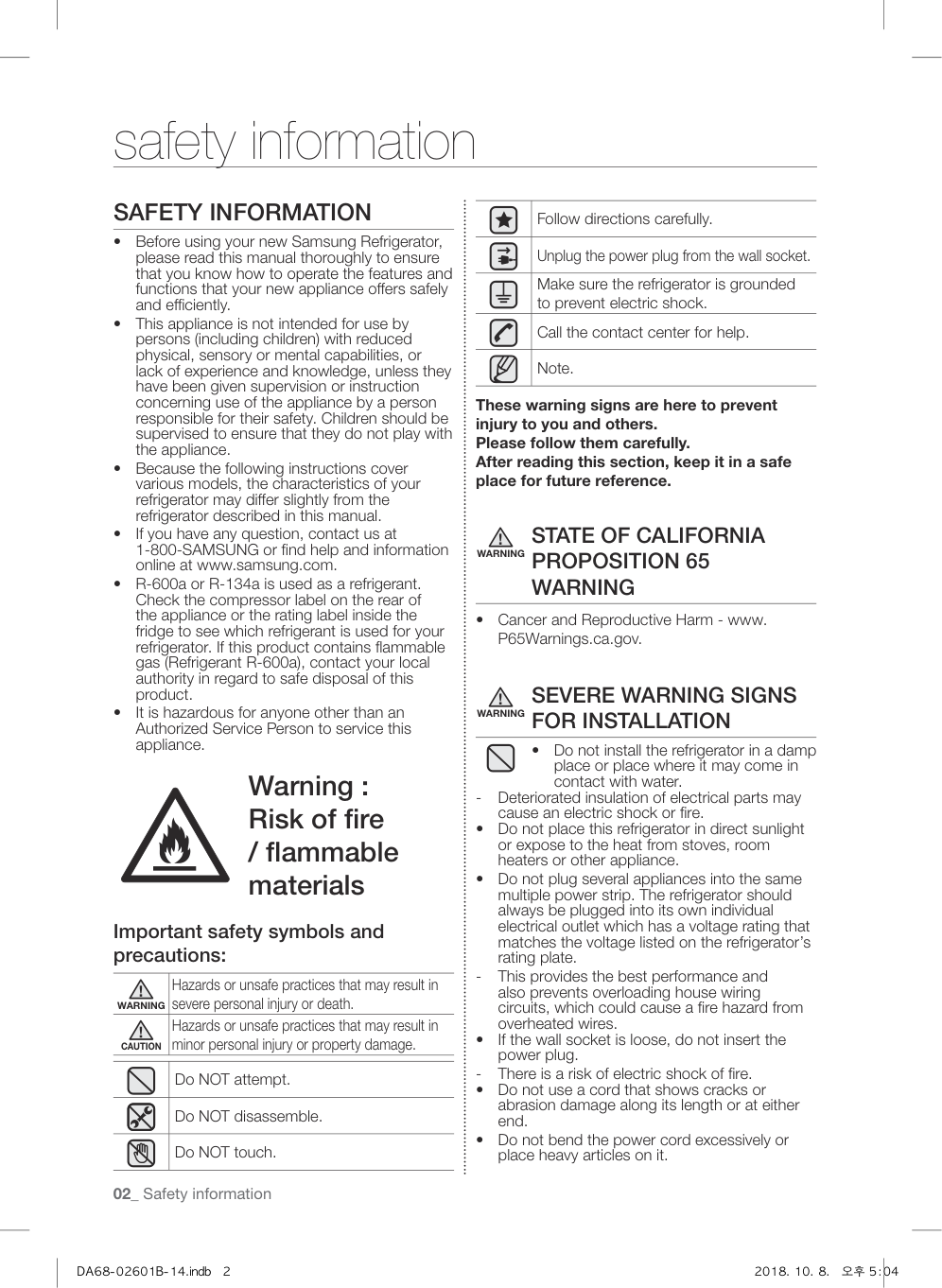 Hazards or unsafe practices that may result in minor personal injury or property damage. Do NOT attempt. Do NOT disassemble. Do NOT touch. Follow directions carefully. Unplug the power plug from the wall socket. Make sure the refrigerator is grounded to prevent electric shock. Call the contact center for help. Note. These warning signs are here to prevent injury to you and others. Please follow them carefully. After reading this section, keep it in a safe place for future reference.State Of California
