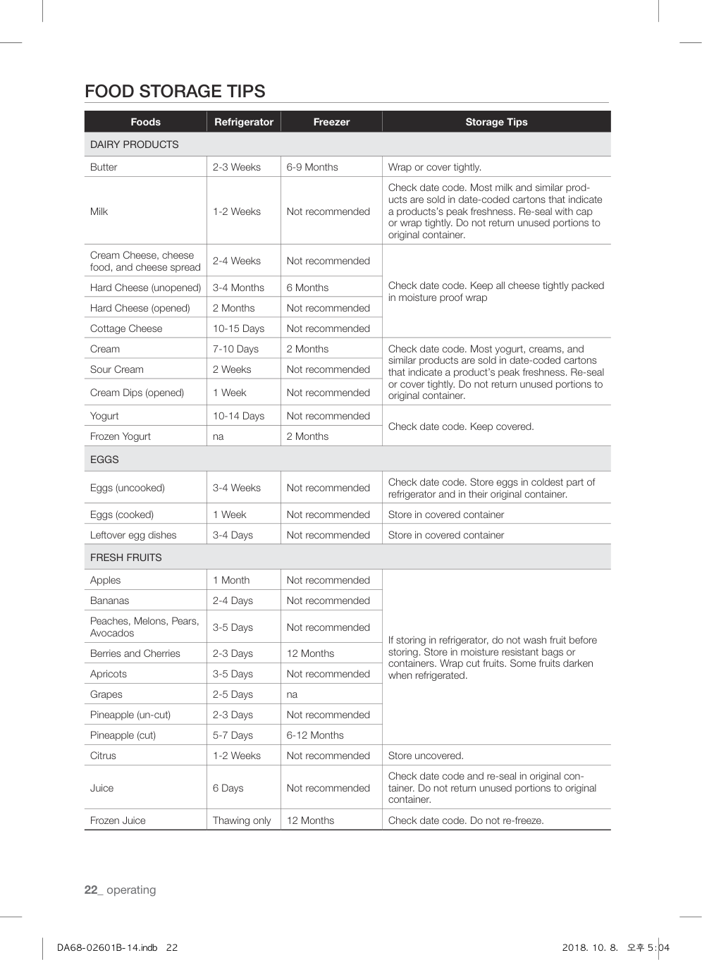 Pommes 1 mois Non recommandé Ne lavez pas le fruit avant le mettre au réfrigéra teur. Conservez dans un sac ou récipient anti- humidité. Emballez les fruits cou - pés. Certains fruits noircissent au réfrigérateur. Bananes 2 à 4 jours Non recommandé Pêches, melons, poires, avocats 3 à 5 jours Non recommandé Baies et cerises 2 à 3 jours 12 mois Abricots 3 à 5 jours Non recommandé Raisin 2 à 5 jours s/o Ananas (entier) 2 à 3 jours Non recommandé Ananas (en morceaux) 5 à 7 jours 6 à 12 mois Agrumes 1 à 2 semaines Non recommandé Conservez sans couvrir. Jus 6 jours Non recommandé Vérifiez la date limite de consommation et conservez dans le récipient d’origine refermé. Ne replacez pas de portions non consommées dans le récipient d’origine. Jus de fruits givré Uniquement le temps de la décongélation 12 mois Vérifiez la date limite de consommation. Ne pas recongeler. DA68-02601B-14.indb 22Fonctionnement _23 02 Fonctionnement Aliments Réfrigérateur Freezer (Congélateur) Conseils de conservation