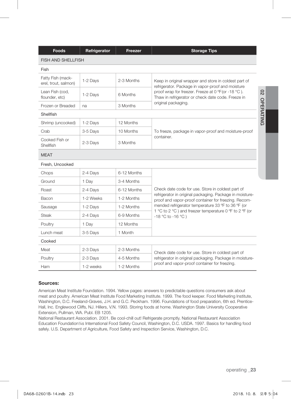 Fraîche, crue Côtelettes 2 à 4 jours 6 à 12 mois Vérifiez la date limite de consommation. Conservez dans la partie la plus froide du réfrigérateur dans son emballage d’origine. Placez dans un récipient étanche à la vapeur et à l’humidité pour la congélation. Tem - pérature recommandée pour le réfrigérateur : 33 ºF à 36 ºF (ou 1 °C à 2 °C) et pour le congélateur : 0 ºF à 2 ºF (ou -18 °C à -16 °C) Viande hachée 1 jour 3 à 4 mois Rôti 2 à 4 jours 6 à 12 mois Bacon 1 à 2 semaines 1 à 2 mois Saucisse 1 à 2 jours 1 à 2 mois Bifteck 2 à 4 jours 6 à 9 mois Volaille 1 jour 12 mois Charcuterie 3 à 5 jours 1 mois Cuite Viande 2 à 3 jours 2 à 3 mois Vérifiez la date limite de consommation. Conservez dans la partie la plus froide du réfrigérateur dans son emballage d’origine. Placez dans un récipient étanche à la vapeur et à l’humidité pour la congélation. Volaille 2 à 3 jours 4 à 5 mois Jambon 1 à 2 semaines 1 à 2 mois Sources : American Meat Institute Foundation. 1994. Pages jaunes : réponses aux questions susceptibles d’être posées par les clients concernant la viande et la volaille. American Meat Institute Food Marketing Institute. 1999. The food keeper. Food Marketing Institute, Washington, D.C. Freeland-Graves, J.H. et G.C. Peckham. 1996. Foundations of food preparation, 6ème édition. Prentice-Hall, Inc. Englewood Cliffs, NJ. Hillers, V.N. 1993. Storing foods at home. Washington State University Cooperative Extension, Pullman, WA. Publ. EB 1205. National Restaurant Association. 2001. Be cool-chill out! Refrigerate promptly. National Restaurant Association Education Foundation¼s International Food Safety Council, Washington, D.C. USDA. 1997. Basics for handling food safely. U.S. Department of Agriculture, Food Safety and Inspection Service, Washington, D.C. DA68-02601B-14.indb 2324_ Troubleshooting Dépannage