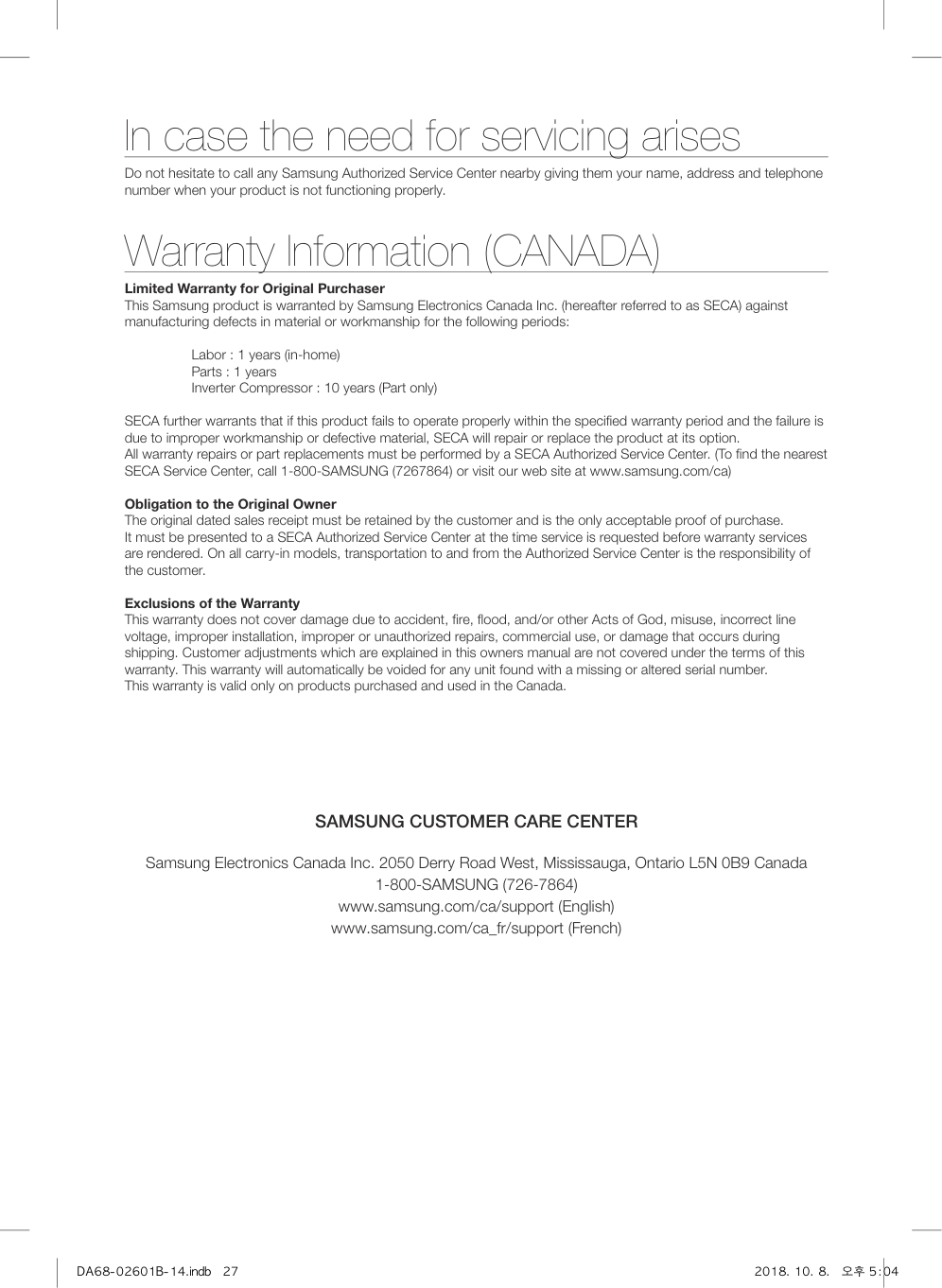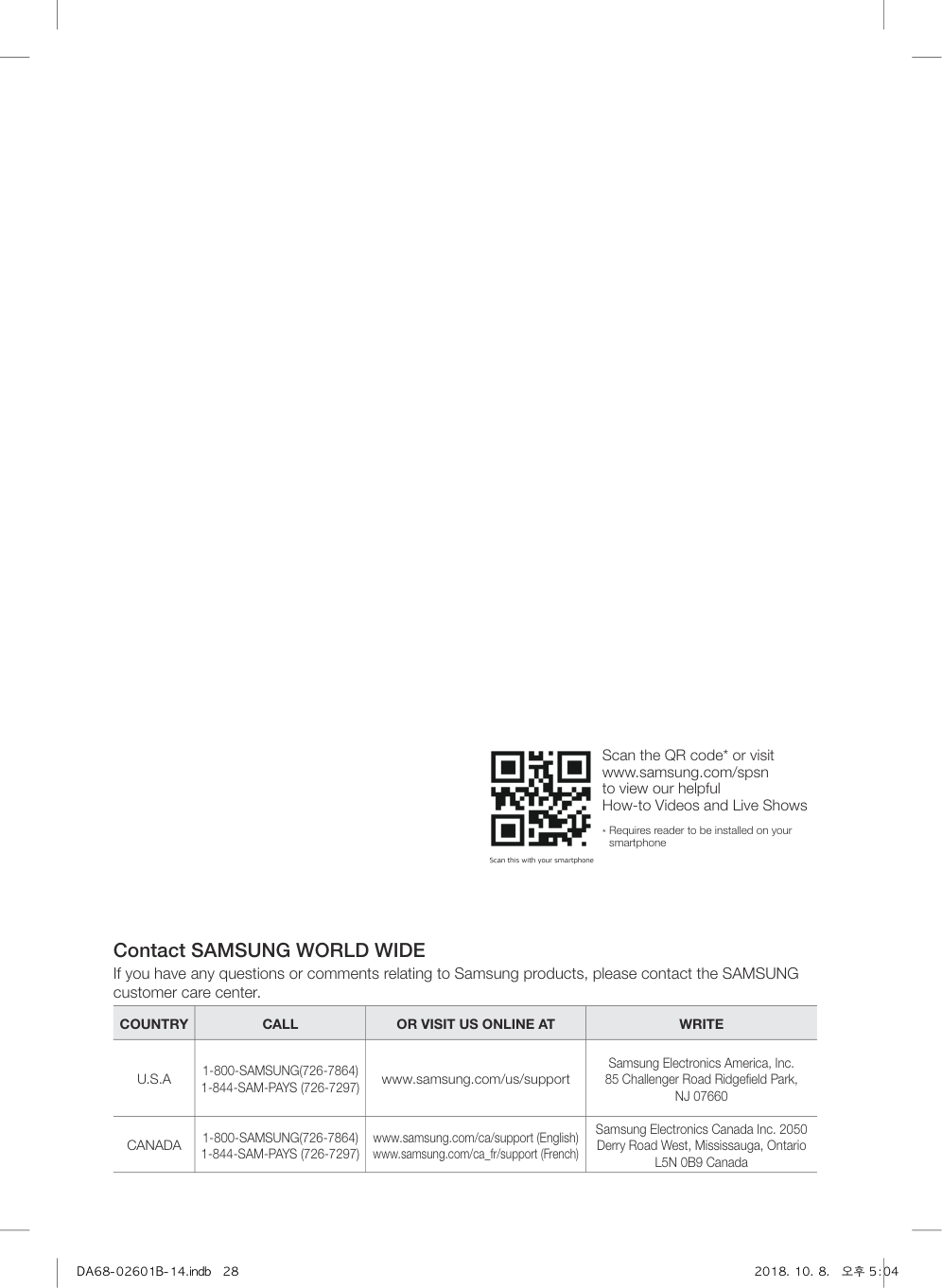 www.samsung.com/ca/support (English) www.samsung.com/ca_fr/support (French) DA68-02601B-14.indb 25Comment contacter Samsung dans le monde Si vous avez des suggestions ou des questions concernant les produits Samsung, veuillez contacter le Service Consommateurs Samsung.
