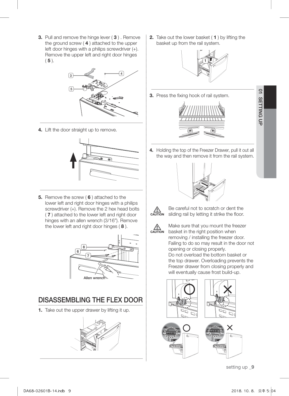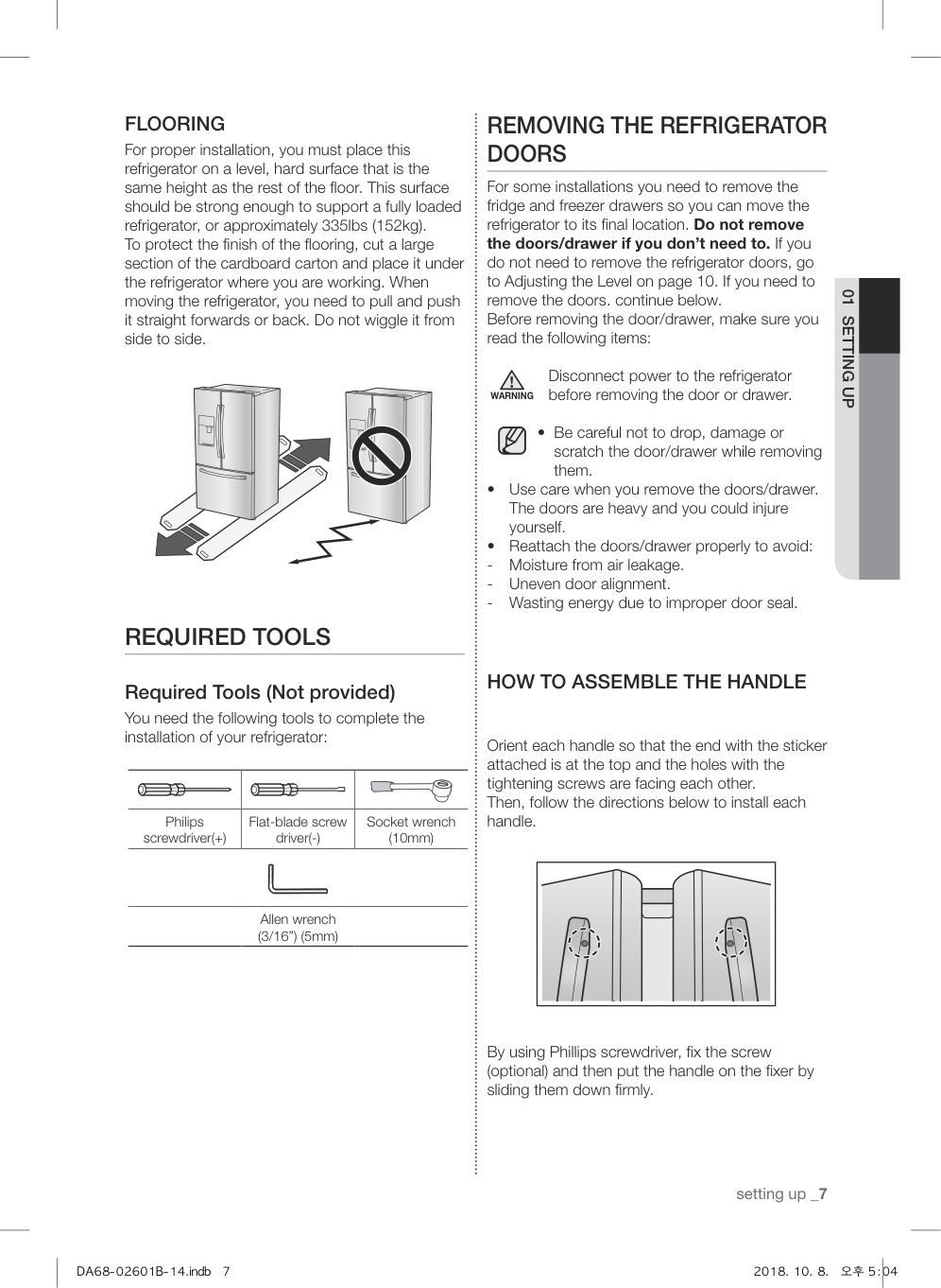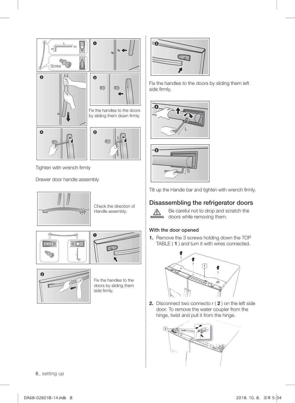 DA68-02601B-14.indb 78_ setting up 2 1 3 5 4 Fix the handles to the doors by sliding them down firmly. Screw Tighten with wrench firmly Drawer door handle assembly Check the direction of Handle assembly. 1 2 Fix the handles to the doors by sliding them side firmly. 3 Fix the handles to the doors by sliding them left side firmly. 4 5 Tilt up the Handle bar and tighten with wrench firmly. Disassembling the refrigerator doors Be careful not to drop and scratch the doors while removing them. With the door opened
