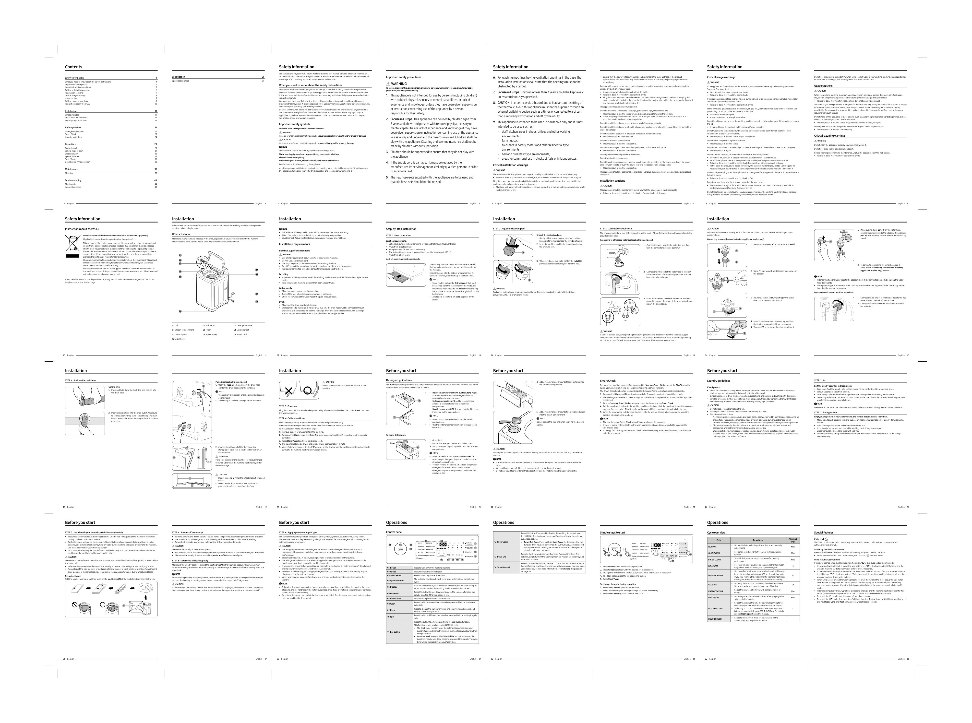 Does not turn on. ࡞ Make sure you use rated power for the product. ࡞ Make sure the power cord is completely plugged in. ࡞ Check the fuse or reset the circuit breaker. Does not start. ࡞ Make sure the lid is closed. ࡞ Make sure the water taps are open. ࡞ Make sure to press Start/Pause (or press and hold Start/Pause for 3 seconds) to start the washing machine. ࡞ Make sure Child Lock is not activated. ࡞ Before the washing machine starts to ѣ̷̷ࡨ̈ϩ will make a series of clicking noises to check the lid’s lock and does a quick drain. (This only applies to the models with the lid-locking feature.) ࡞ Was the lid opened during the spinning cycle? Close the lid, and press Start/Pause (or press and hold Start/Pause for 3 seconds) to resume. (This only applies to the models without the lid-locking feature.) ࡞ The machine enters Standby or is in a soaking cycle. Please wait. ࡞ Check the fuse or reset the circuit breaker. Water is not supplied. ࡞ Make sure you press Start/Pause (or press and hold Start/Pause for 3 seconds) after selecting the water supply. ࡞ Make sure the water taps are open. ࡞ Is the ѣlter net at the water supply hose connector clogged? Clean the ѣ̷ter net by brushing with a toothbrush. ࡞ Is the water supply cut off? If the water supply is cut off, close the tap and power off. ࡞ Straighten the water supply hoses. ࡞ Open and close the lid, then press Start/Pause (or press and hold Start/Pause for 3 seconds). ࡞ If the water pressure is low, it takes longer to start washing. ࡞ If the water level is not as high as necessary or lower than expected, use the level selector to adjust the water level. After a cycle, detergent remains in the automatic dispenser. ࡞ Make sure the washing machine is running with sЇ˙ѣcient water pressure. ࡞ Make sure the detergent drawer is properly inserted. ࡞ Remove and clean the detergent drawer, and then try again. English English 45 n o it cA