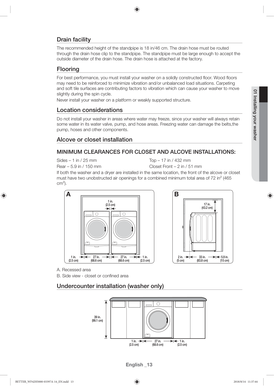 BETTER_WF42H5000-03397A-14_EN.indd 12 2018/8/14 11:37:44English _13 Drain facility The recommended height of the standpipe is 18 in/46 cm. The drain hose must be routed through the drain hose clip to the standpipe. The standpipe must be large enough to accept the outside diameter of the drain hose. The drain hose is attached at the factory. Flooring For best performance, you must install your washer on a solidly constructed floor. Wood floors may need to be reinforced to minimize vibration and/or unbalanced load situations. Carpeting and soft tile surfaces are contributing factors to vibration which can cause your washer to move slightly during the spin cycle. Never install your washer on a platform or weakly supported structure. Location considerations Do not install your washer in areas where water may freeze, since your washer will always retain some water in its water valve, pump, and hose areas. Freezing water can damage the belts,the pump, hoses and other components. Alcove or closet installation