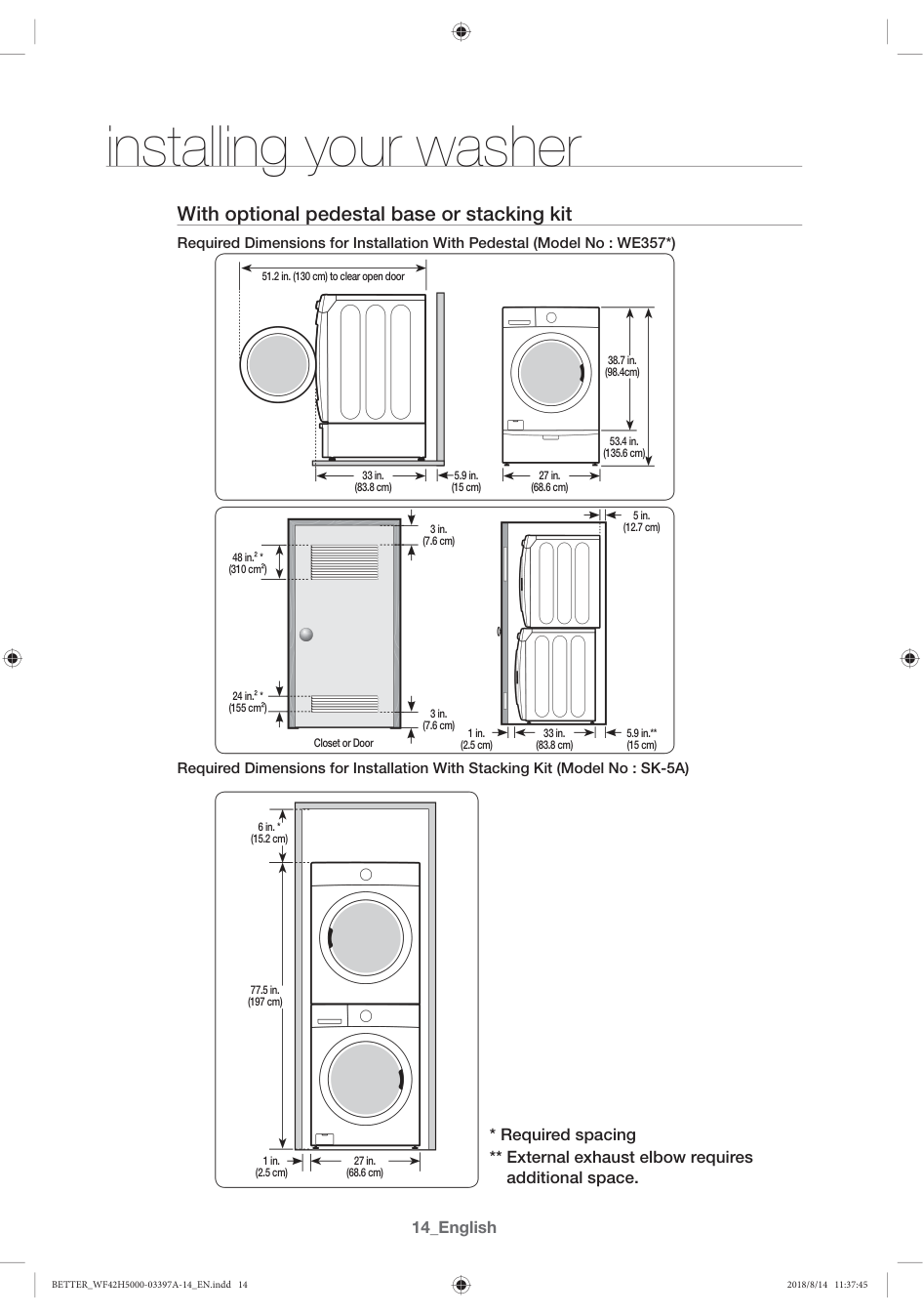 1 in. (2.5 cm) 27 in. (68.6 cm) 1 in. (2.5 cm) 1 in. (2.5 cm) 27 in. (68.6 cm) BETTER_WF42H5000-03397A-14_EN.indd 13 2018/8/14 11:37:4414_English installing your washer With optional pedestal base or stacking kit Required Dimensions for Installation With Pedestal (Model No : WE357*) Required Dimensions for Installation With Stacking Kit (Model No : SK-5A) 33 in. (83.8 cm) 5.9 in. (15 cm) 51.2 in. (130 cm) to clear open door 27 in. (68.6 cm) 38.7 in. (98.4cm) 53.4 in. (135.6 cm) 33 in. (83.8 cm) 3 in. (7.6 cm) Closet or Door 48 in.² * (310 cm²) 3 in. (7.6 cm) 24 in.² * (155 cm²) 1 in. (2.5 cm) 5.9 in.** (15 cm) 5 in. (12.7 cm) 6 in. * (15.2 cm) 1 in. (2.5 cm) 77.5 in. (197 cm) 27 in. (68.6 cm)