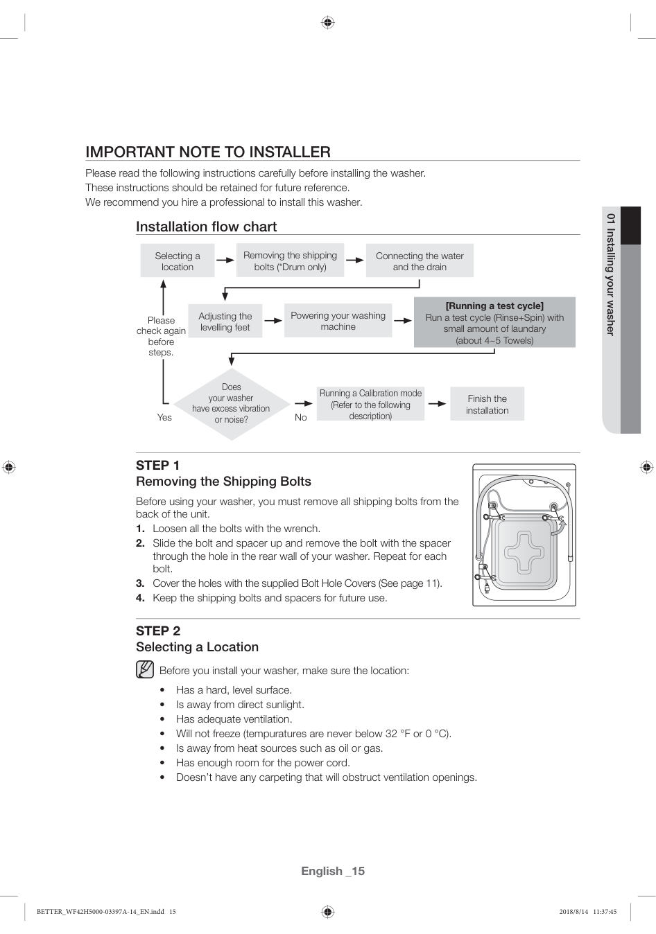Please read the following instructions carefully before installing the washer. These instructions should be retained for future reference. We recommend you hire a professional to install this washer. Installation flow chart Selecting a location Running a Calibration mode (Refer to the following description) Finish the installation Removing the shipping bolts (*Drum only) Connecting the water and the drain Adjusting the levelling feet Powering your washing machine [Running a test cycle] Run a test cycle (Rinse+Spin) with small amount of laundary (about 4~5 Towels) Yes Please check again before steps. No Does your washer have excess vibration or noise?Step 1