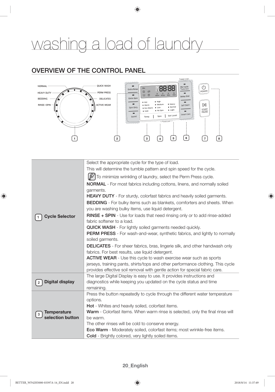 Cycle Selector Select the appropriate cycle for the type of load. This will determine the tumble pattern and spin speed for the cycle. To minimize wrinkling of laundry, select the Perm Press cycle. NORMAL - For most fabrics including cottons, linens, and normally soiled garments. HEAVY DUTY - For sturdy, colorfast fabrics and heavily soiled garments. BEDDING - For bulky items such as blankets, comforters and sheets. When you are washing bulky items, use liquid detergent. RINSE + SPIN - Use for loads that need rinsing only or to add rinse-added fabric softener to a load. QUICK WASH - For lightly soiled garments needed quickly. PERM PRESS - For wash-and-wear, synthetic fabrics, and lightly to normally soiled garments. DELICATES - For sheer fabrics, bras, lingerie silk, and other handwash only fabrics. For best results, use liquid detergent. ACTIVE WEAR - Use this cycle to wash exercise wear such as sports jerseys, training pants, shirts/tops and other performance clothing. This cycle provides effective soil removal with gentle action for special fabric care. Digital display The large Digital Display is easy to use. It provides instructions and diagnostics while keeping you updated on the cycle status and time remaining. Temperature selection button Press the button repeatedly to cycle through the different water temperature options. Hot - Whites and heavily soiled, colorfast items. Warm - Colorfast items. When warm rinse is selected, only the final rinse will be warm. The other rinses will be cold to conserve energy. Eco Warm - Moderately soiled, colorfast items; most wrinkle-free items. Cold - Brightly colored, very lightly soiled items. 3 4 5 6 7 1 8 2 1 2 3 BETTER_WF42H5000-03397A-14_EN.indd 20 2018/8/14 11:37:49English _21 Spin selection button Press the button repeatedly to cycle through the different spin speed options. (Rins hold (All Lamp Turn Off) Æ No Spin Æ Low Æ Medium Æ High ) To minimize wrinkling of wrinkle free and no iron fabrics, DO NOT use overload your Washer. High - Use for underwear, t-shirts, jeans and sturdy cottons. Medium - Use for jeans, wrinkle-free or wash-and-wear items and synthetics. Low - Use for delicate items needing a slow spin speed. No Spin - Drains your Washer without spinning. Use for extremely delicate items that cannot tolerate any spin. Rinse Hold (All Lamp Turn Off) - The laundry remains soaking in the final rinse water. Either a drain or spin cycle must be performed to unload the laundry. Soil Level selection button Press the button to select the soil level/washing time. (Light Æ Normal Æ Heavy) Heavy - For heavily soiled loads. Normal - For moderately soiled loads. This setting is best for most loads. Light - For lightly soiled loads. Select Cycle Option Press these buttons to select different cycle options. Extra Rinse - Add an additional rinse at the end of the cycle to remove laundry additives and perfumes more thoroughly. Extra Spin - Add additional time to remove more water from loads. Spin Only - The option to start only Spin of each course. Sound - When you activate the Sound off function, the “Sound [ ]” lamp illuminates. My Cycle - Choose your favorite cycle including temperature, spin, soil level, options, etc. (see page 23) Delay End - Any cycle can be delayed for up to 24 hours in one-hour increments. Displayed hour indicates the time at which the wash will be ended. (See page 23). Self Clean+ - Use to clean dirt and possible mold from the drum. Regular use (after every 40 washes) is recommended. No detergent or bleach is needed (see page 32). Smart Care - This function enables you to check the status of the washing machine using a smartphone. Start/Pause selection button Press to pause and restart programs. Power button Press once to turn your washer on, press again to turn your washer off. If the washer is left on for more than 10 minutes without any buttons being touched, the power automatically turns off. 03 washing a load of laundry 5 4 6 7 8 BETTER_WF42H5000-03397A-14_EN.indd 21 2018/8/14 11:37:49