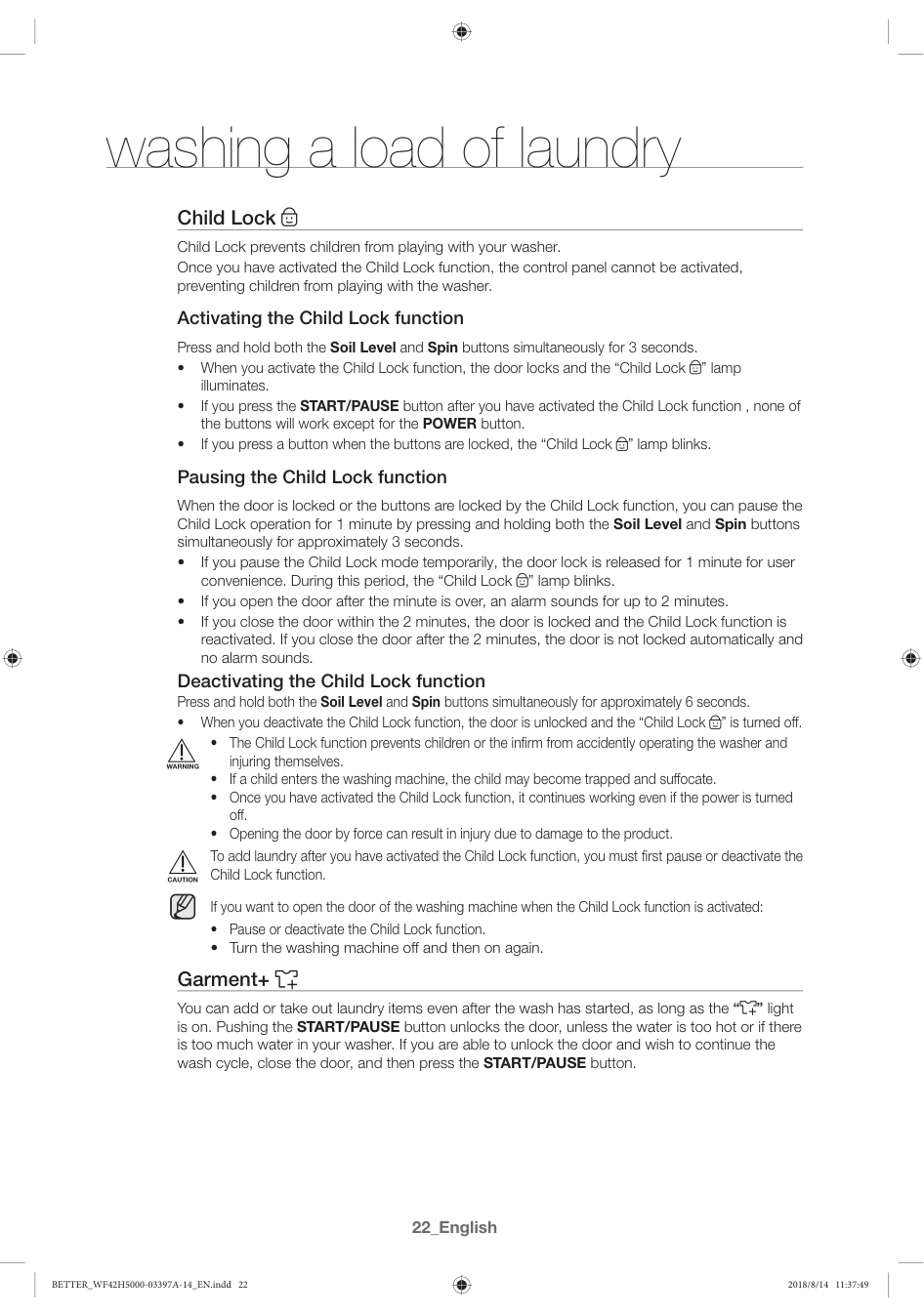 22_English Child Lock Child Lock prevents children from playing with your washer. Once you have activated the Child Lock function, the control panel cannot be activated, preventing children from playing with the washer. Activating the Child Lock function Press and hold both the Soil Level and Spin buttons simultaneously for 3 seconds. š When you activate the Child Lock function, the door locks and the “Child Lock ” lamp illuminates. š If you press the START/PAUSE button after you have activated the Child Lock function , none of the buttons will work except for the POWER button. š If you press a button when the buttons are locked, the “Child Lock ” lamp blinks. Pausing the Child Lock function When the door is locked or the buttons are locked by the Child Lock function, you can pause the Child Lock operation for 1 minute by pressing and holding both the Soil Level and Spin buttons simultaneously for approximately 3 seconds. š If you pause the Child Lock mode temporarily, the door lock is released for 1 minute for user convenience. During this period, the “Child Lock ” lamp blinks. š If you open the door after the minute is over, an alarm sounds for up to 2 minutes. š If you close the door within the 2 minutes, the door is locked and the Child Lock function is reactivated. If you close the door after the 2 minutes, the door is not locked automatically and no alarm sounds. Deactivating the Child Lock function Press and hold both the Soil Level and Spin buttons simultaneously for approximately 6 seconds. š When you deactivate the Child Lock function, the door is unlocked and the “Child Lock ” is turned off. š 7KH&KLOG/RFNIXQFWLRQSUHYHQWVFKLOGUHQRUWKHLQıUPIURPDFFLGHQWO\RSHUDWLQJWKHZDVKHUDQG injuring themselves. š ,IDFKLOGHQWHUVWKHZDVKLQJPDFKLQHWKHFKLOGPD\EHFRPHWUDSSHGDQGVXijRFDWH š 2QFH\RXKDYHDFWLYDWHGWKH&KLOG/RFNIXQFWLRQLWFRQWLQXHVZRUNLQJHYHQLIWKHSRZHULVWXUQHG off. š 2SHQLQJWKHGRRUE\IRUFHFDQUHVXOWLQLQMXU\GXHWRGDPDJHWRWKHSURGXFW To add laundry after you have activated the Child Lock function, you must first pause or deactivate the Child Lock function. If you want to open the door of the washing machine when the Child Lock function is activated: š 3DXVHRUGHDFWLYDWHWKH&KLOG/RFNIXQFWLRQ š 7XUQWKHZDVKLQJPDFKLQHRijDQGWKHQRQDJDLQ Garment+ You can add or take out laundry items even after the wash has started, as long as the “ ” light is on. Pushing the START/PAUSE button unlocks the door, unless the water is too hot or if there is too much water in your washer. If you are able to unlock the door and wish to continue the wash cycle, close the door, and then press the START/PAUSE button. washing a load of laundry