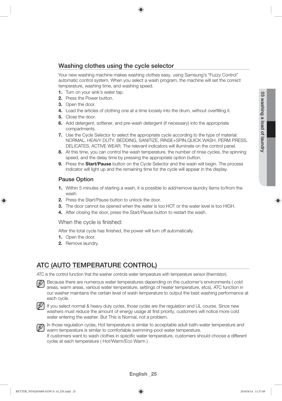ATC is the control function that the washer controls water temperature with temperature sensor (thermistor). Because there are numerous water temperatures depending on the customer’s environments ( cold areas, warm areas, various water temperature, settings of heater temperature, etcs), ATC function in our washer maintains the certain level of wash temperature to output the best washing performance at each cycle. If you select normal & heavy duty cycles, those cycles are the regulation and UL course. Since new washers must reduce the amount of energy usage at first priority, customers will notice more cold water entering the washer. But This is Normal, not a problem. In those regulation cycles, Hot temperature is similar to acceptable adult bath-water temperature and warm temperature is similar to comfortable swimming-pool water temperature. If customers want to wash clothes in specific water temperature, customers should choose a different cycles at each temperature ( Hot/Warm/Eco Warm ) 03 washing a load of laundry BETTER_WF42H5000-03397A-14_EN.indd 25 2018/8/14 11:37:4926_English