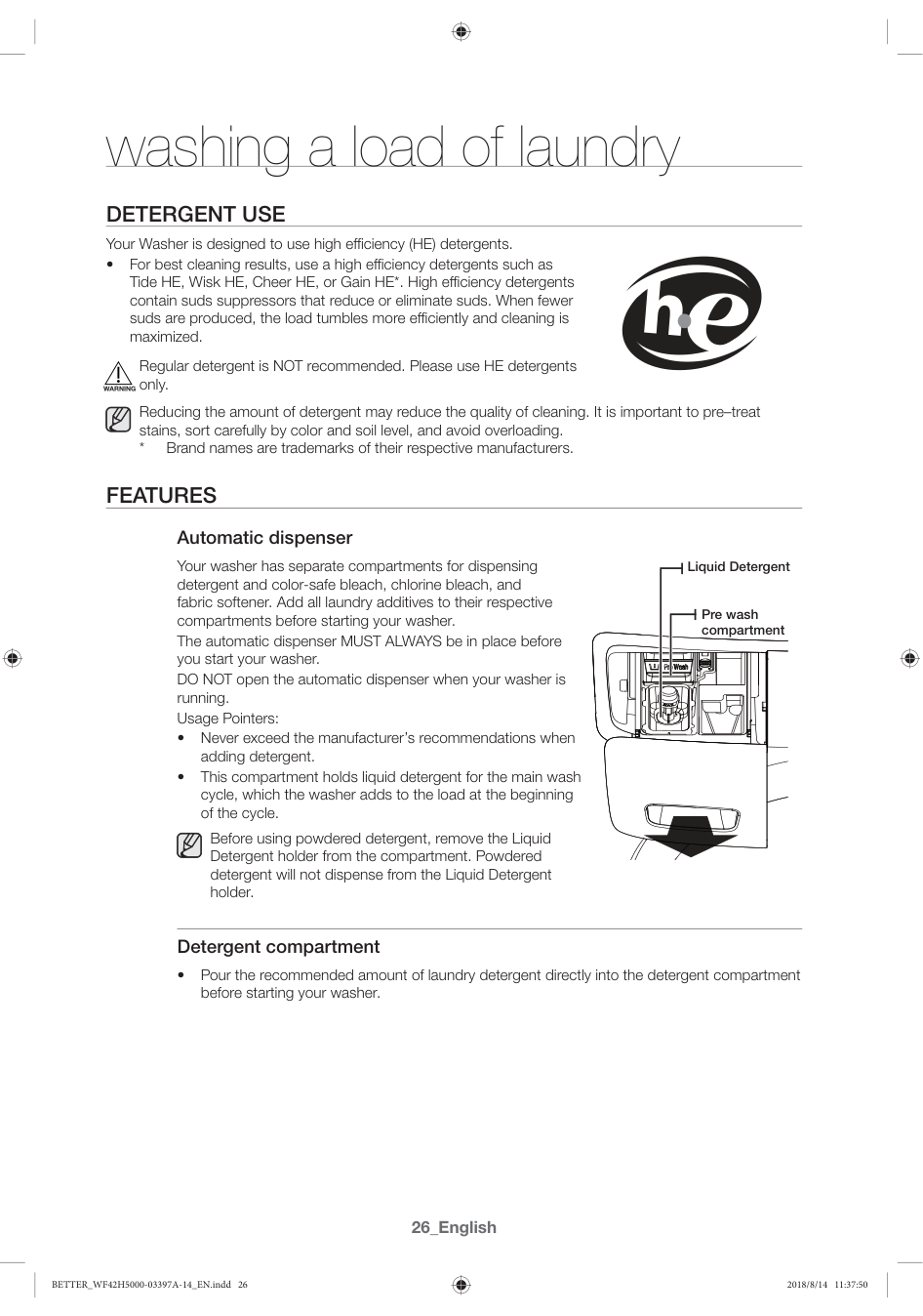 Your Washer is designed to use high efficiency (HE) detergents. š For best cleaning results, use a high efficiency detergents such as Tide HE, Wisk HE, Cheer HE, or Gain HE*. High efficiency detergents contain suds suppressors that reduce or eliminate suds. When fewer suds are produced, the load tumbles more efficiently and cleaning is maximized. Regular detergent is NOT recommended. Please use HE detergents only. Reducing the amount of detergent may reduce the quality of cleaning. It is important to pre–treat stains, sort carefully by color and soil level, and avoid overloading.Features