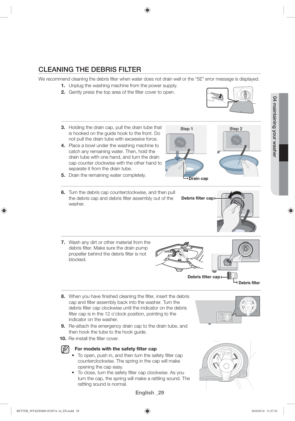 Unplug the washing machine, gently press the filter cover to open, pull the drain tube to the front, turn the drain cap counterclockwise to separate it, drain remaining water, turn the debris cap counterclockwise and pull it out, wash dirt from the filter, then reinsert and turn the debris cap clockwise until the indicator points to 12 o'clock. Re-attach the emergency drain cap and reinstall the filter cover. (Page 29)