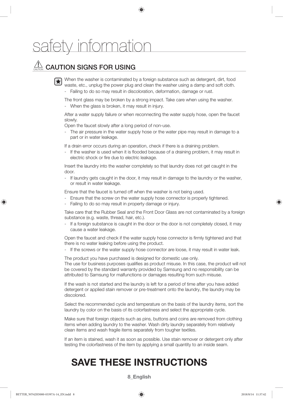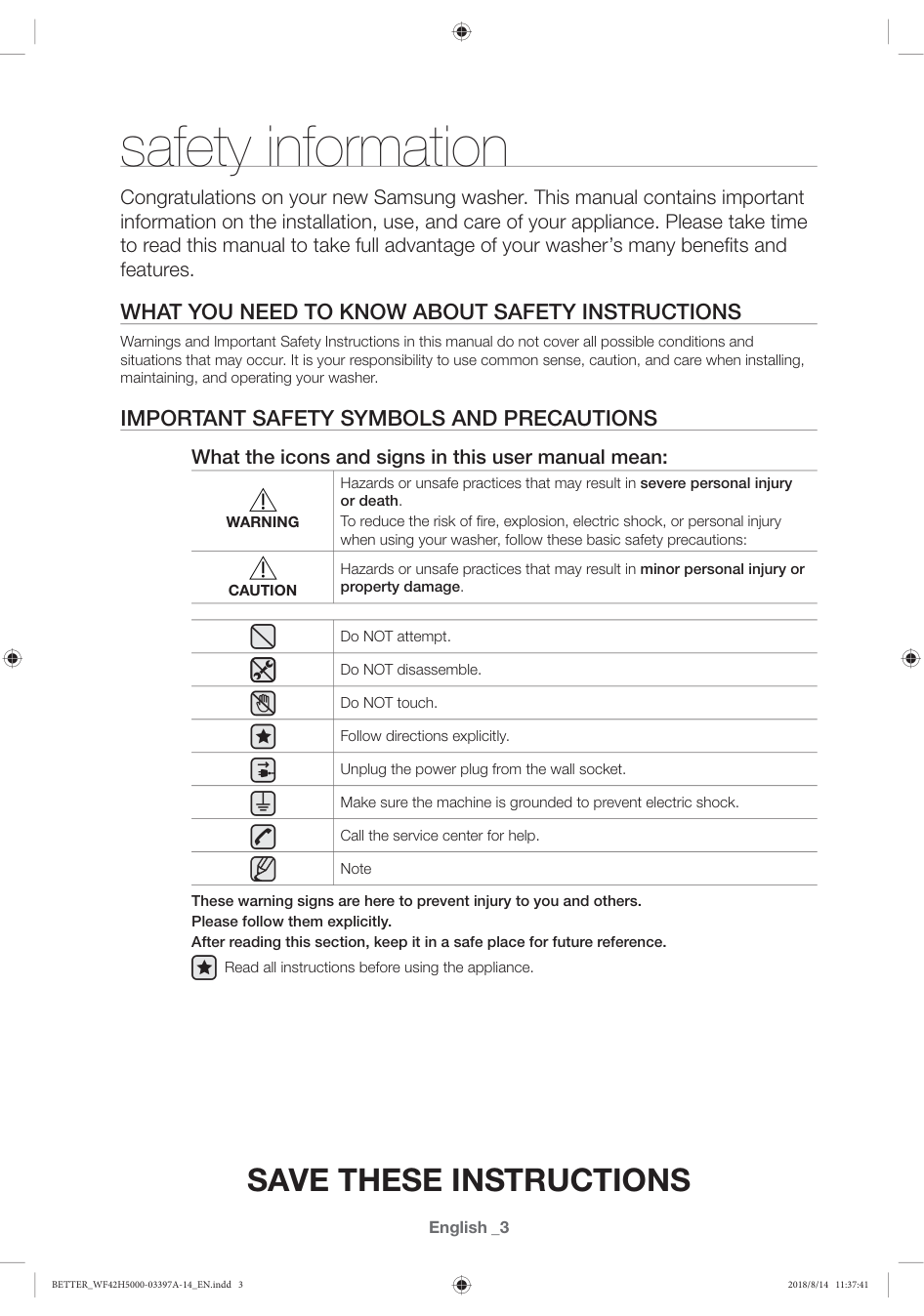 36 36 Fabric care chart 37 Cycle chart 38 Helping the environment 38 Declaration of conformity 38 Specification BETTER_WF42H5000-03397A-14_EN.indd 2 2018/8/14 11:37:41English _3 safety information Congratulations on your new Samsung washer. This manual contains important information on the installation, use, and care of your appliance. Please take time to read this manual to take full advantage of your washer’s many benefits and features.