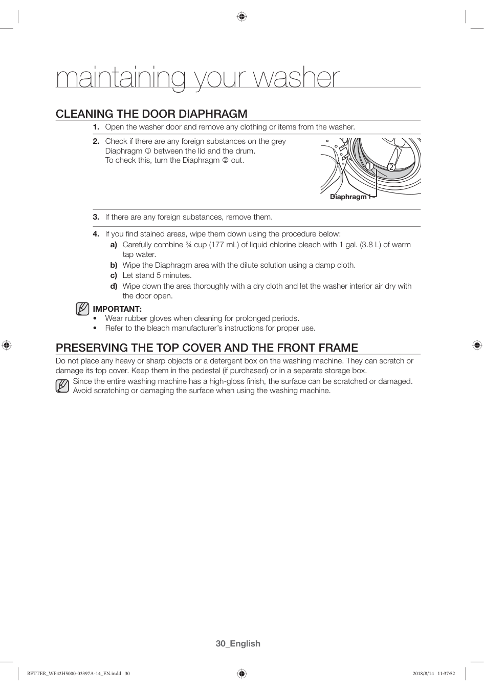 No coloque objetos pesados ni afilados ni tampoco el paquete de detergente sobre la lavadora. Pueden rayar o dañar la cubierta superior. Manténgalos apartados en el pedestal (si lo adquirió) o en una caja de almacenaje por separado. Ya que toda la lavadora tiene un acabado brillante, la superficie se puede rayar o dañar fácilmente. Evite rayar o dañar la superficie cuando use la lavadora. 04 mantenimiento de la lavadora Diafragma BETTER_WF42H5000-03397A-14_MES.indd 31 2018/8/14 11:39:3532_Español