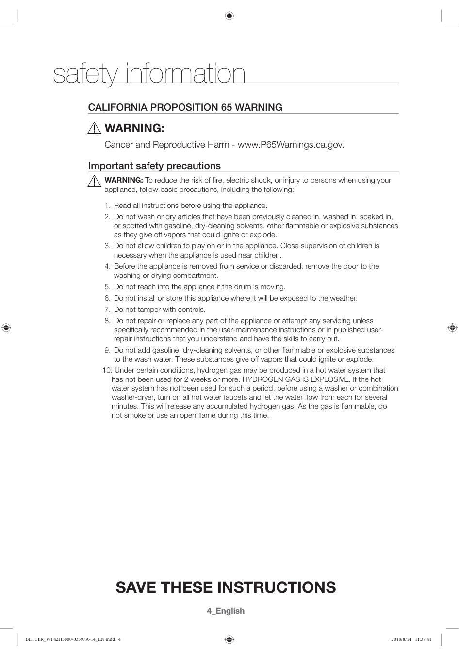 Cancer and Reproductive Harm - www.P65Warnings.ca.gov. Important safety precautions WARNING: To reduce the risk of fire, electric shock, or injury to persons when using your appliance, follow basic precautions, including the following:English _5