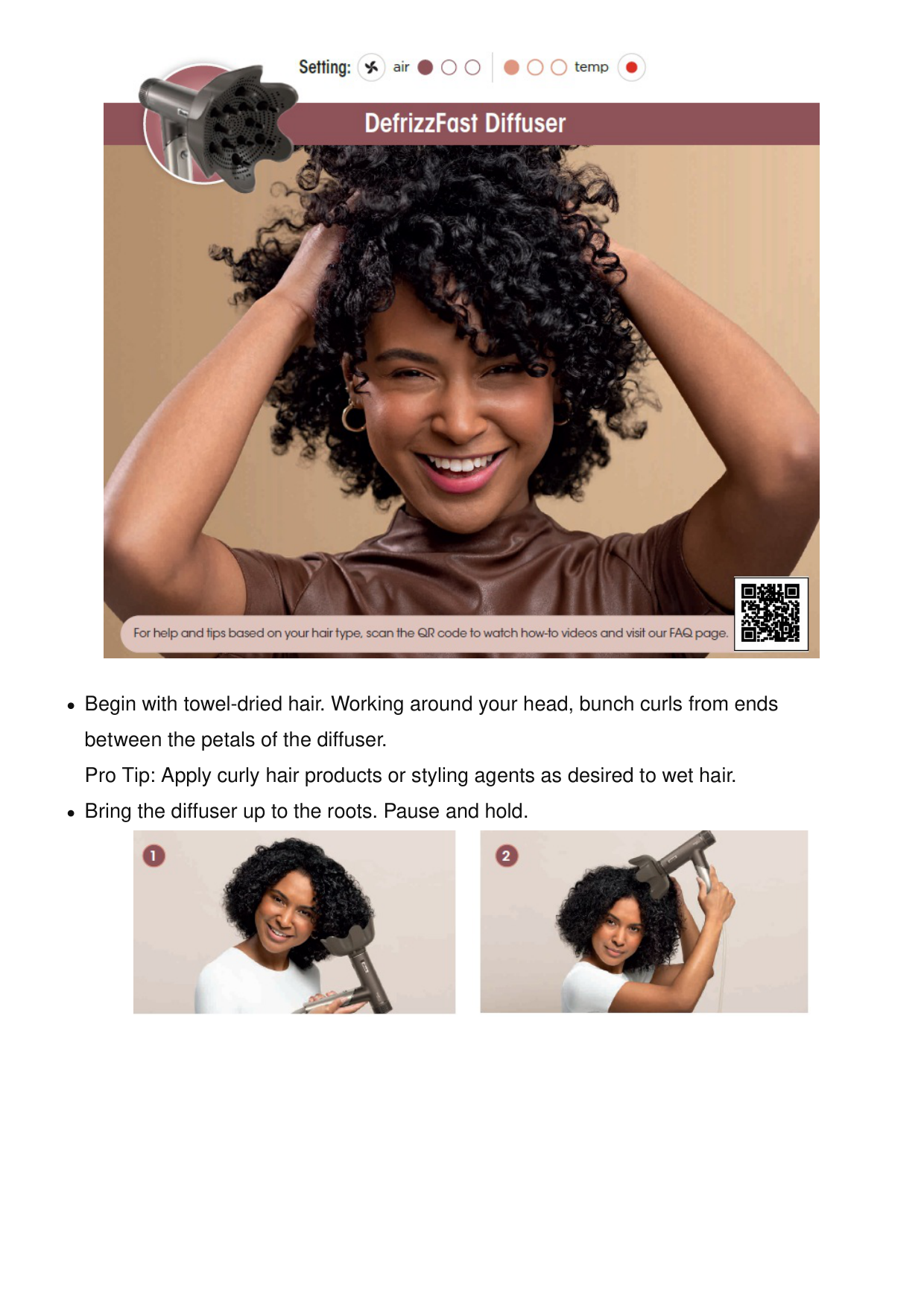 Begin with towel-dried hair. Working around your head, bunch curls from ends between the petals of the diffuser. Pro Tip: Apply curly hair products or styling agents as desired to wet hair. Bring the diffuser up to the roots. Pause and hold.