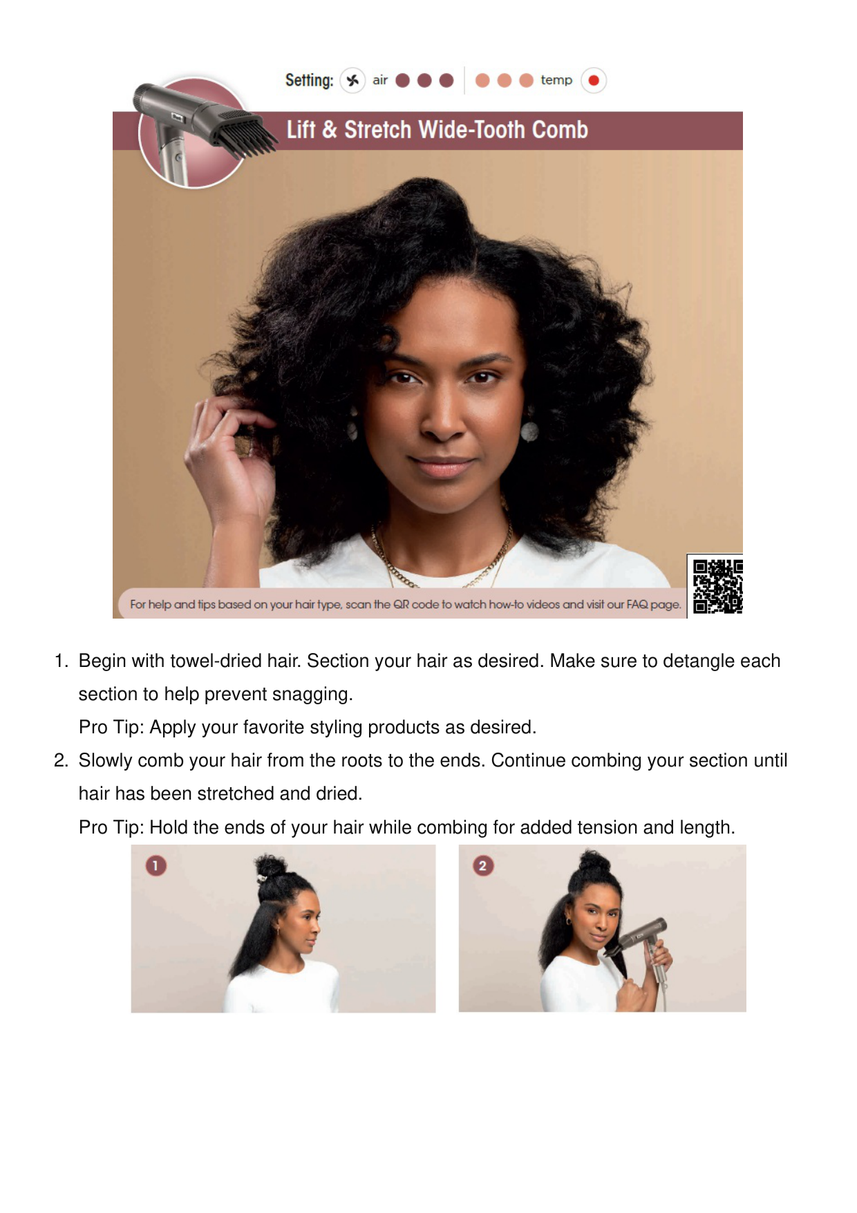 Additional Styling Tips: Apply curly hair products to wet hair before drying to help define your curls and cut down on frizz. If you have thick hair, try increasing the heat for even faster results. Lift & Stretch Wide-Tooth Comb Stretch your natural hair.