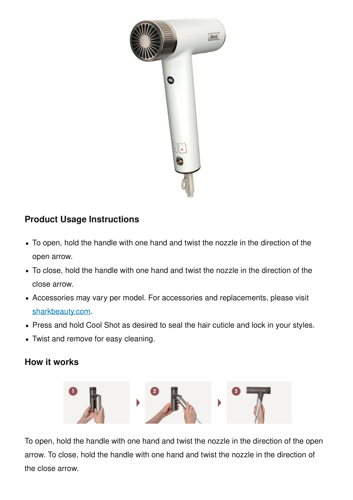 9 Documents / Resources 9.1 References Shark HD500 Series Pro FLEX Hair Dryer System Manuals+ Shark-logoProduct Usage Instructions To open, hold the handle with one hand and twist the nozzle in the direction of the open arrow. To close, hold the handle with one hand and twist the nozzle in the direction of the close arrow. Accessories may vary per model. For accessories and replacements, please visit sharkbeauty.com. Press and hold Cool Shot as desired to seal the hair cuticle and lock in your styles. Twist and remove for easy cleaning. How it works To open, hold the handle with one hand and twist the nozzle in the direction of the open arrow. To close, hold the handle with one hand and twist the nozzle in the direction of the close arrow.